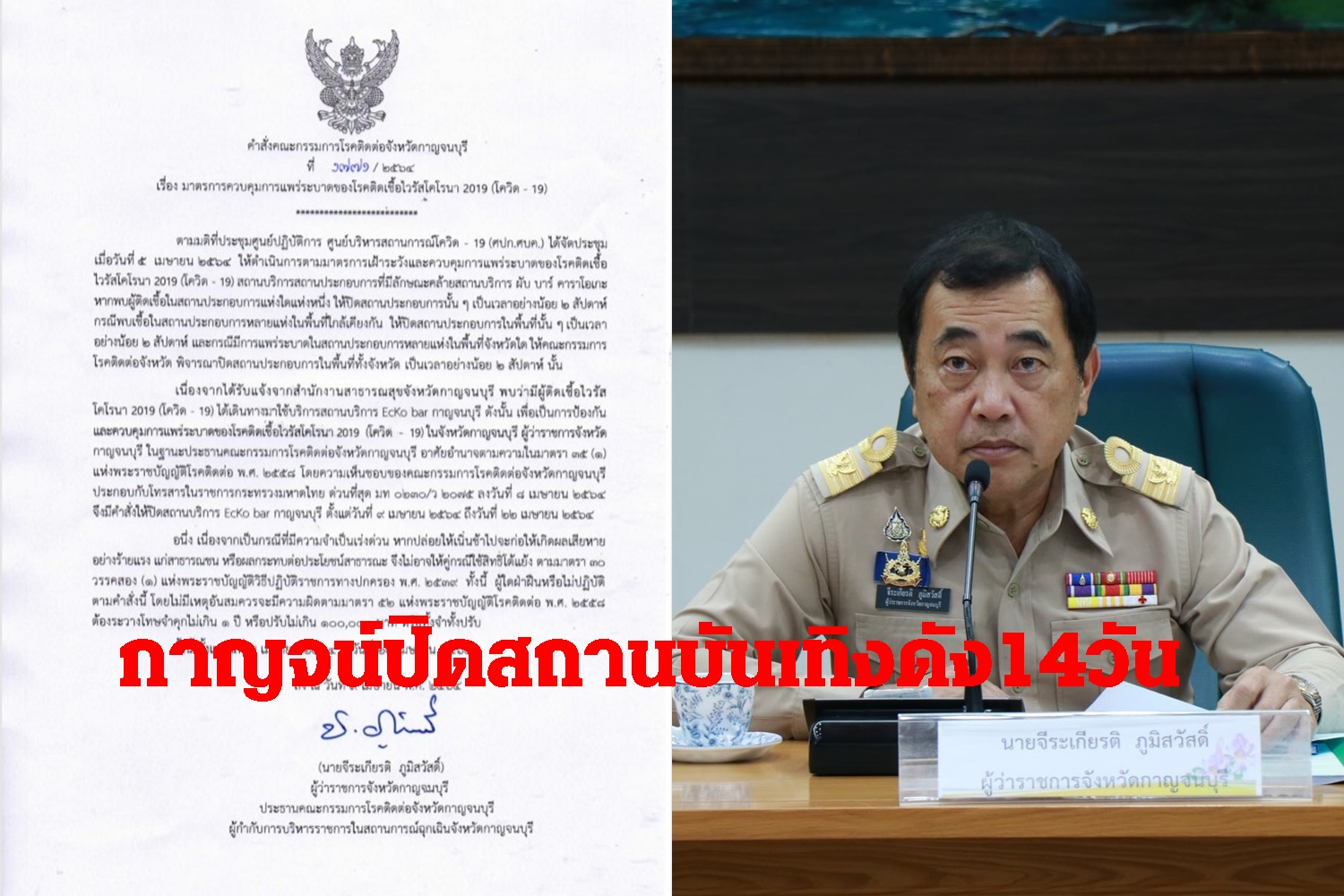 เนื่องจากได้รับแจ้งจากสำนักงานสาธารณสุขจังหวัดกาญจนบุรี พบว่ามีผู้ติดเชื้อไวรัสโคโรนา 2019 (โควิด - 19) ได้เดินทางมาใช้บริการสถานบริการ EcKo bar กาญจนบุรี ดังนั้น เพื่อเป็นการป้องกัน และควบคุมการแพร่ระบาดของโรคติดเชื้อไวรัสโคโรนา 2019 (โควิด - 19) ในจังหวัดกาญจนบุรี ผู้ว่าราชการจังหวัดกาญจนบุรี ในฐานะประธานคณะกรรมการโรคติดต่อจังหวัดกาญจนบุรี อาศัยอำนาจตามความในมาตรา 35 (1) แห่งพระราชบัญญัติโรคติดต่อ พ.ศ. 2558 โดยความเห็นชอบของคณะกรรมการโรคติดต่อจังหวัดกาญจนบุรี ประกอบกับโทรสารในราชการกระทรวงมหาดไทย ด่วนที่สุด มท 0230/ว 2075 ลงวันที่ 8 เมษายน 2564 จึงมีคำสั่งให้ปิดสถานบริการ EcKo bar กาญจนบุรี ตั้งแต่วันที่ 9 เมษายน 2564 ถึงวันที่ 22 เมษายน 2564