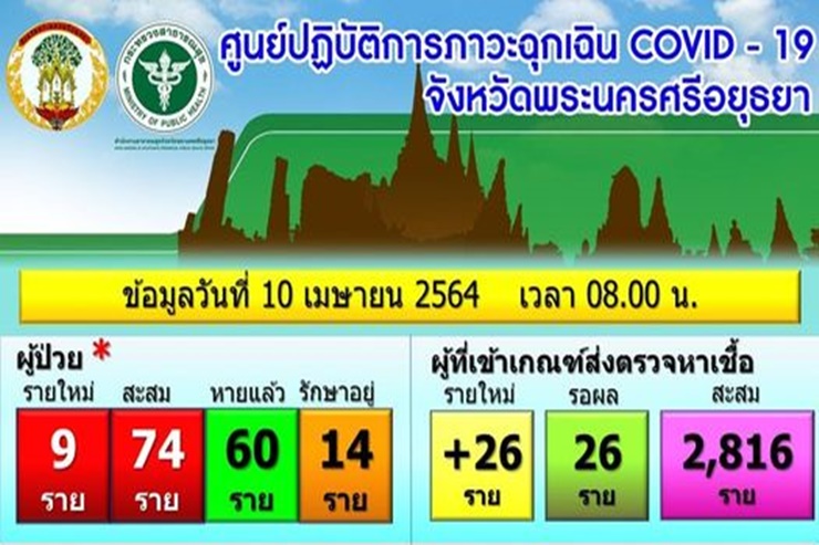 เมื่อวันที่ 10 เม.ย. 64 นายภานุ แย้มศรี ผู้ว่าราชการ จ.พระนครศรีอยุธยา กล่าวถึงสถานการณ์การแพร่ระบาดของโรคโควิด-19ในพื้นที่จ.พระนครศรีอยุธยา ว่า เช้าวันนี้ สำนักงานสาธารณสุขจังหวัด ฯ ได้รายงานตัวเลขยอดผู้ติดเชื้อโควิด-19 รายใหม่เข้ามาถึง 9 คน ถือเป็นยอดผู้ป่วยติดเชื้อรายใหม่ต่อวัน จำนวนมากที่สุด ทำให้ยอดผู้ติดเชื้อสะสมของจังหวัด สูงถึง 74 คนแล้ว โดยในจำนวนนี้รักษาตัวจนหายขาดแล้ว 60 คน และต้องพักรักษาตัวในโรงพยาบาลอีก 14 คน