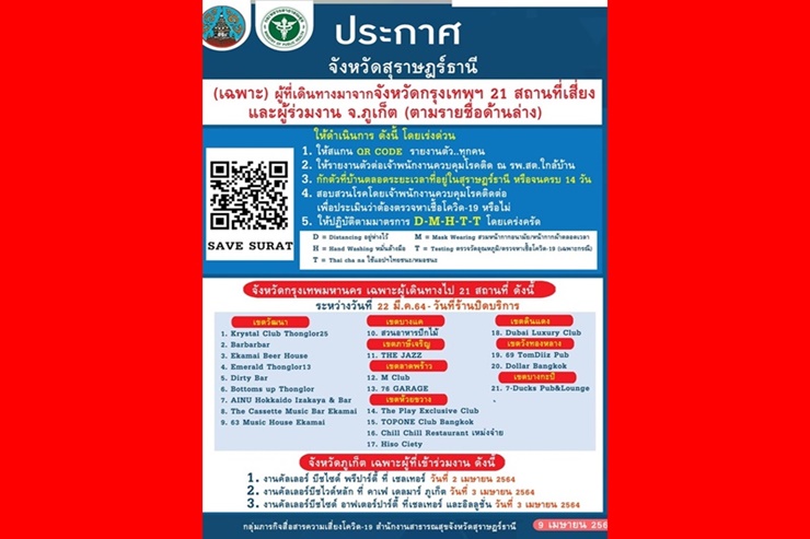 ทั้งนี้ ผู้ที่เดินทางมาจากกรุงเทพฯที่เคยไป 21 สถานที่เสี่ยง ผับ บาร์ ร้านอาหารที่เกิดระบาดโควิด-19 ในเขตวัฒนา เขตบางแค เขตภาษีเจริญ เขตลาดพร้าว เขตห้วยขวาง เขตดินแดง เขตวังทองหลางและเขตบางกะปิ ระหว่างวันที่ 22 มี.ค.64 ถึงวันปิดร้าน และจาก จ.ภูเก็ต งานคัลเลอร์บีชไซด์ พรีปาร์ตี้ที่เชลเทอร์ งานคัลเลอร์บีชไวด์หลัก ที่คาเฟ่ เดลมาร์ภูเก็ตและ งานคัลเลอร์บีชไซด์ อาฟเตอร์ปาร์ตี้ ที่เชลเทอร์และอิลลูชั่น เมื่อวันที่ 2-3 เม.ย.64 ผู้ที่เคยไปสถานที่ดังกล่าวจะเข้ามายัง จ.สุราษฎร์ธานี จะต้องสแกนคิวอาร์โค้ด เซพสุราษฎร์ รายงานตัวทุกคนและให้รายงานตัวต่อเจ้าพนักงานควบคุมโรคในพื้นที่(กำนัน ผู้ใหญ่บ้าน อบต.)เพื่อประเมินความเสี่ยง