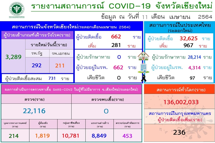 เมื่อวันที่ 11 เม.ย. 64 เพจเฟซบุ๊ก ประชาสัมพันธ์ สำนักงานสาธารณสุขจังหวัดเชียงใหม่ รายงานสถานการณ์การแพร่ระบาดของไวรัสโควิด-19 วันที่ 11 เมษายน 2564 พบผู้ป่วยโควิด-19 รายใหม่ ในพื้นที่จังหวัดเชียงใหม่ จำนวน 281 ราย นับรวมเป็น 662 ราย ของการระบาดรอบใหม่แล้ว และยอดสะสมรวมของจังหวัดเชียงใหม่เป็นทั้งสิ้น 731 ราย ผู้ป่วยยังอยู่โรงพยาบาล 662 ราย ขณะที่ รายละเอียดไทม์ไลน์ จังหวัดจะแถลงให้ทราบอีกครั้ง