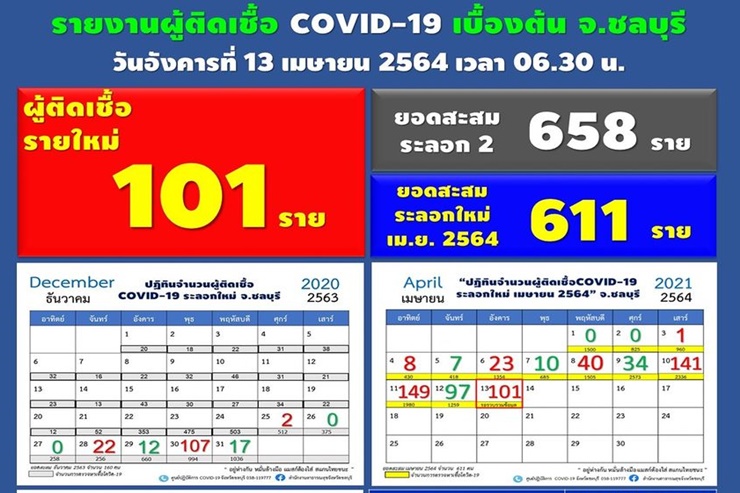 เมื่อวันที่ 13 เม.ย. 64 เพจเฟซบุ๊ก สำนักงานประชาสัมพันธ์จังหวัดชลบุรี - Chonburi PR รายงานว่า วันนี้มีรายงานผู้ติดเชื้อโควิด-19 รายใหม่ จำนวน 101 ราย