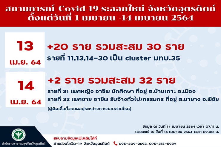 เมื่อวันที่ 14 เม.ย.64 เพจสำนักงานสาธารณสุขจังหวัดอุตรดิตถ์ รายงานสถานการณ์การระบาดเชื้อไวรัสโควิด-19 จ.อุตรดิตถ์ ดังนี้ พบผู้ติดเชื้อรายที่ 11, 13, 14-30 เป็นคลัสเตอร์จาก มทบ.53 (มณฑลทหารบกที่ 35 ค่ายพิชัยดาบหัก จ.อุตรดิตถ์) รวม 19 ราย ส่วนรายที่ 12 เป็นนักศึกษาชาย ภูมิลำเนา ต.บ้านหม้อ อ.พิชัย และ รายที่ 31 นักศึกษาหญิง ภูมิลำเนา ต.บ้านเกาะ อ.เมืองอุตรดิตถ์ และ รายที่ 32 ล่าสุด เป็นเพศชายอาชีพรับจ้างทั่วไป ภูมิลำเนา ต.นายาง อ.พิชัย ส่งผลยอดสะสมผู้ติดเชื้อโควิด-19ระลอกใหม่ตั้งแต่วันที่ 9-14 เม.ย. รวม 32 ราย