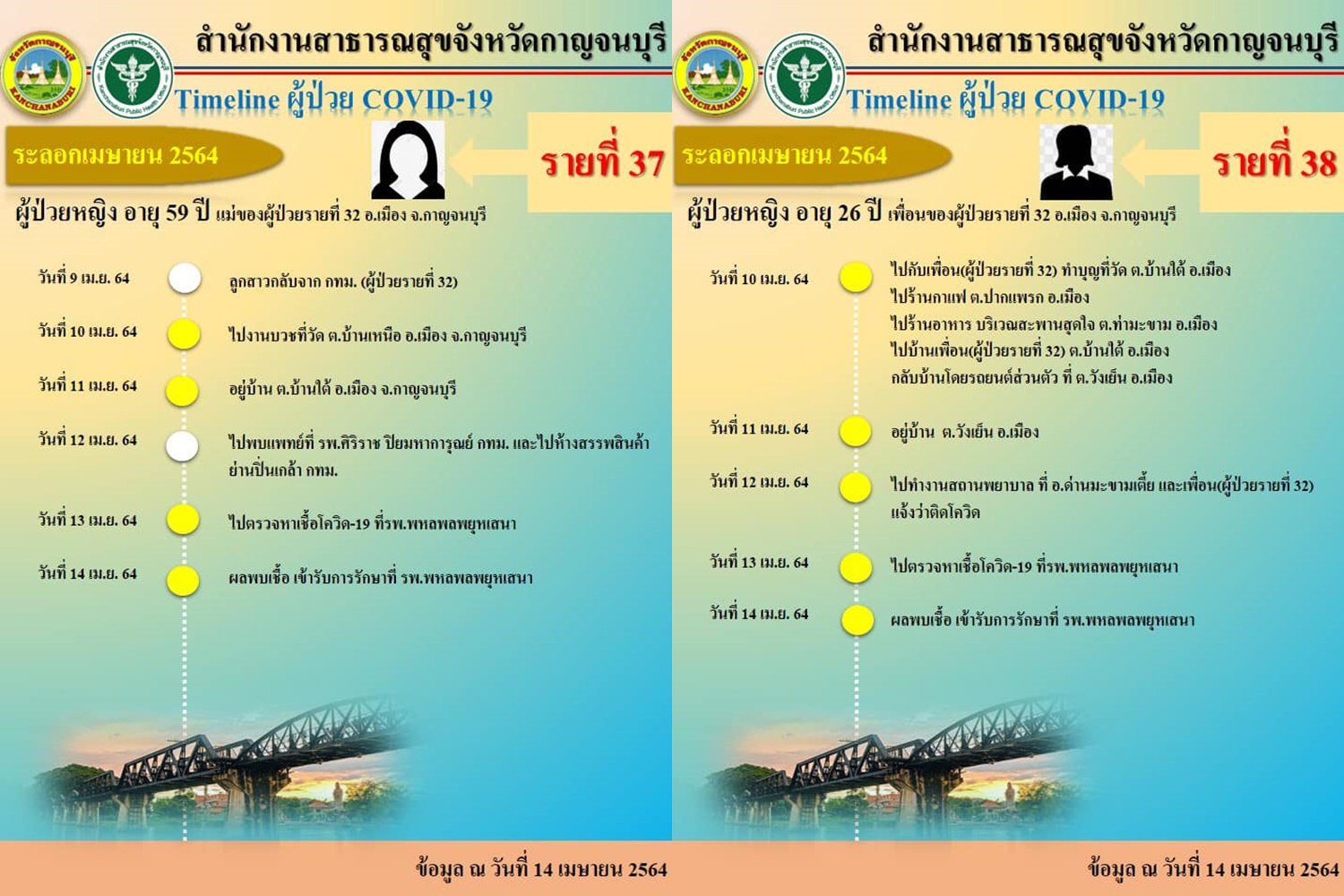 เมื่อวันที่ 14 เม.ย.64 สาธารณสุขจังหวัดกาญจนบุรี รายงานว่า พบผู้ติดเชื้อไวรัสโควิด-19 เพิ่มอีก 2 ราย (รายที่ 37 – 38) ทำให้มีจำนวนผู้ป่วยสะสม38 รายทั้งหมดเข้ารับการรักษาที่โรงพยาบาลเรียบร้อยแล้ว