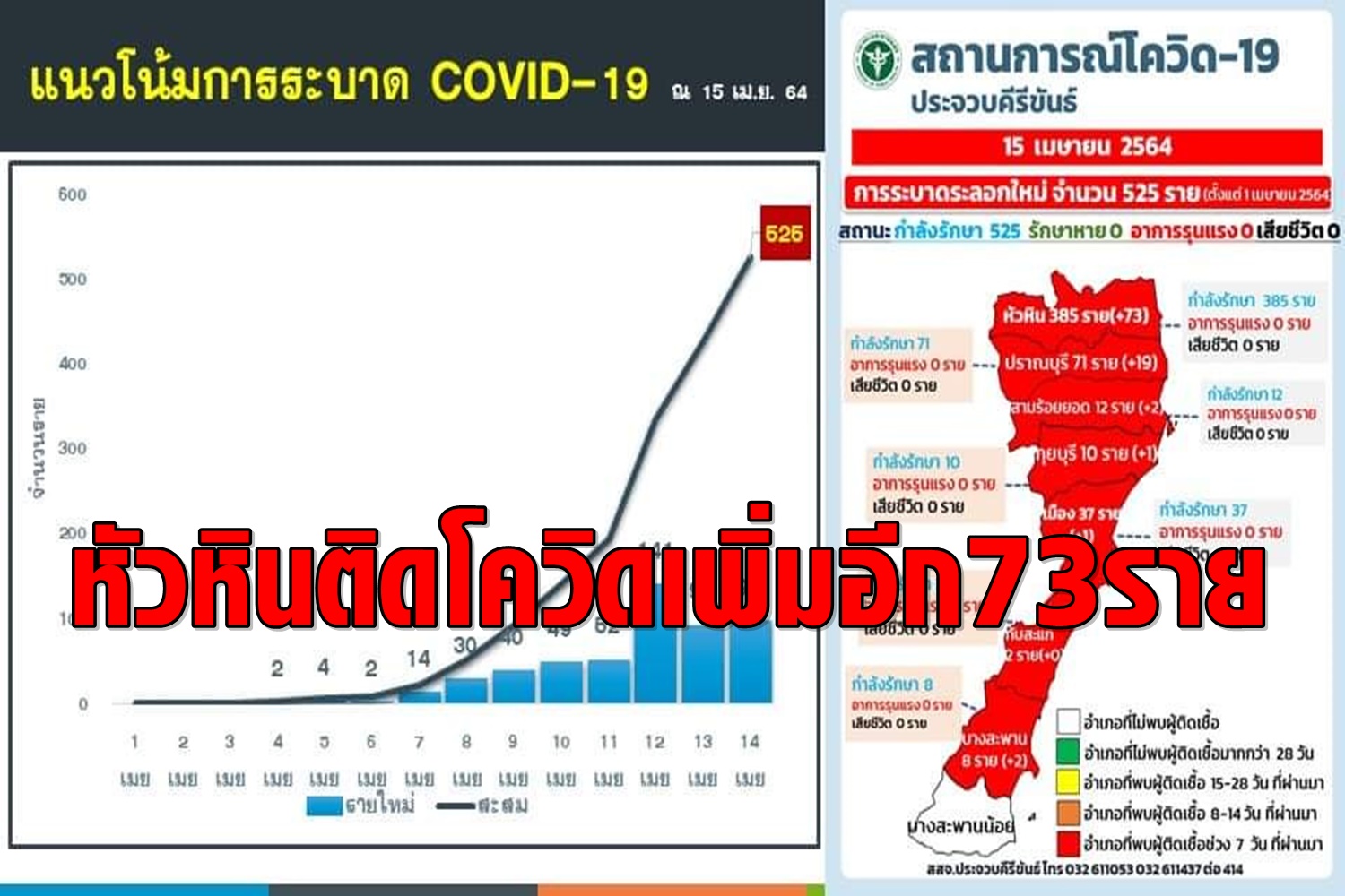 เมื่อวันที่ 15 เม.ย. 64 จังหวัดประจวบคีรีขันธ์รายงาน สถานการณ์แพร่ระบาดของเชื้อไวรัสโควิด-19ประจำวันพบผู้ติดเชื้อรายใหม่ 98 ราย โดยเป็นผู้ติดเชื้อในเขตอำเภอหัวหินถึง 73 ราย ที่เหลือเป็นผู้ติดเชื้อจากอำเภออื่นๆ โดยยอดผู้ติดเชื้อสะสมมีจำนวน 525 ราย คาดว่าภายใน 1-2 วันนี้ จะมียอดผู้ติดเชื้อสูงเกินกว่า 600 ราย