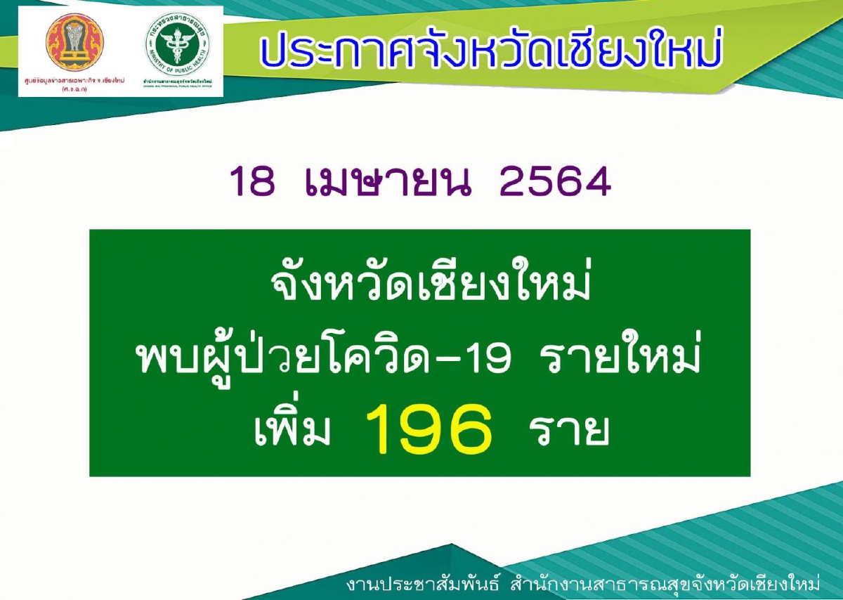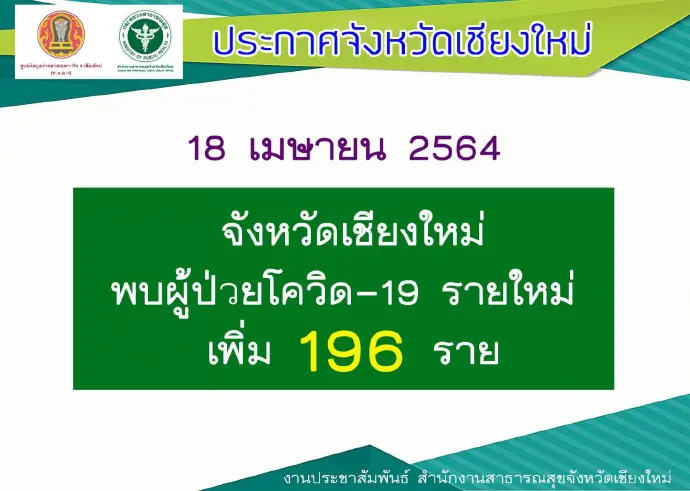 เมื่อวันที่ 18 เมษายน สำนักงานสาธารณสุขจังหวัดเชียงใหม่ รายงานว่า วันนี้จังหวัดเชียงใหม่ตรวจพบผู้ติดเชื้อโควิด-19 รายใหม่เพิ่มอีก 196 คน นับรวมเป็น 2,233 คน ของการระบาดรอบใหม่แล้ว ซึ่งทั้งหมดยังรักษาตัวอยู่ในโรงพยาบาล ขณะที่กลุ่มเสี่ยงที่ได้รับการตรวจไปแล้วมีทั้งสิ้นกว่า 30,113 คน และยังอยู่ระหว่างการตรวจและรอผลตรวจอีกจำนวนมาก ซึ่งเจ้าหน้าที่กำลังเร่งดำเนินการทางห้องปฏิบัติการและเน้นย้ำขอความร่วมมือให้กักตัวอยู่ตลอดระหว่างรอผลตรวจ