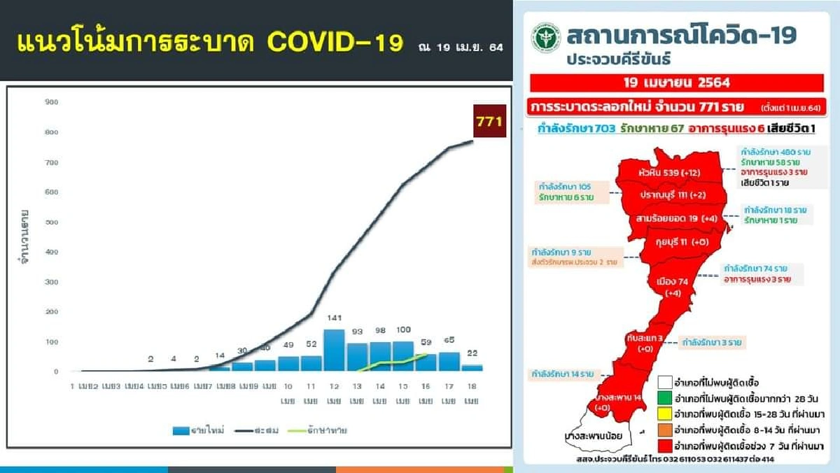 เมื่อวันที่ 19 เมษายน นพ.สุริยะ คูหะรัตน์ นายแพทย์สาธารณสุขจังหวัดประจวบคีรีขันธ์ เปิดเผยว่า มีผู้ป่วยยืนยันติดเชื้อโควิด-19 รายใหม่ลดลงเหลือ 22 คน ทำให้ยอดสะสมผู้ติดเชื้อการระบาดระลอกใหม่มีจำนวนรวม 771 คน มีผู้ป่วยที่ยังคงรับการรักษาในโรงพยาบาล 703 คน รักษาหายแล้ว 67 คน ขณะเดียวกันมีผู้ป่วยอาการรุนแรง 6 คน อาการปานกลาง 4 คน และมีผู้เสียชีวิต 1 คนที่ห้องไอซียูโรงพยาบาลหัวหิน เป็นผู้ป่วยเพศหญิงอายุ 61 ปี ชาว อ.หัวหิน ติดเชื้อจากญาติที่เดินทางไปเที่ยวสถานบันเทิง เข้ารับการรักษาเมื่อวันที่ 11 เมษายนที่ผ่านมา ด้วยอาการปกติ แต่ผู้ป่วยมีโรคประจำตัวเป็นโรคหัวใจ ความดัน เบาหวาน และไทรอยด์ จากนั้นมีอาการเต้นของหัวใจผิดปกติเมื่อวันที่ 15 เมษายน แพทย์นำตัวเข้ารับการรักษาในห้องไอซียูกระทั่งเสียชีวิตในเวลาต่อมา
