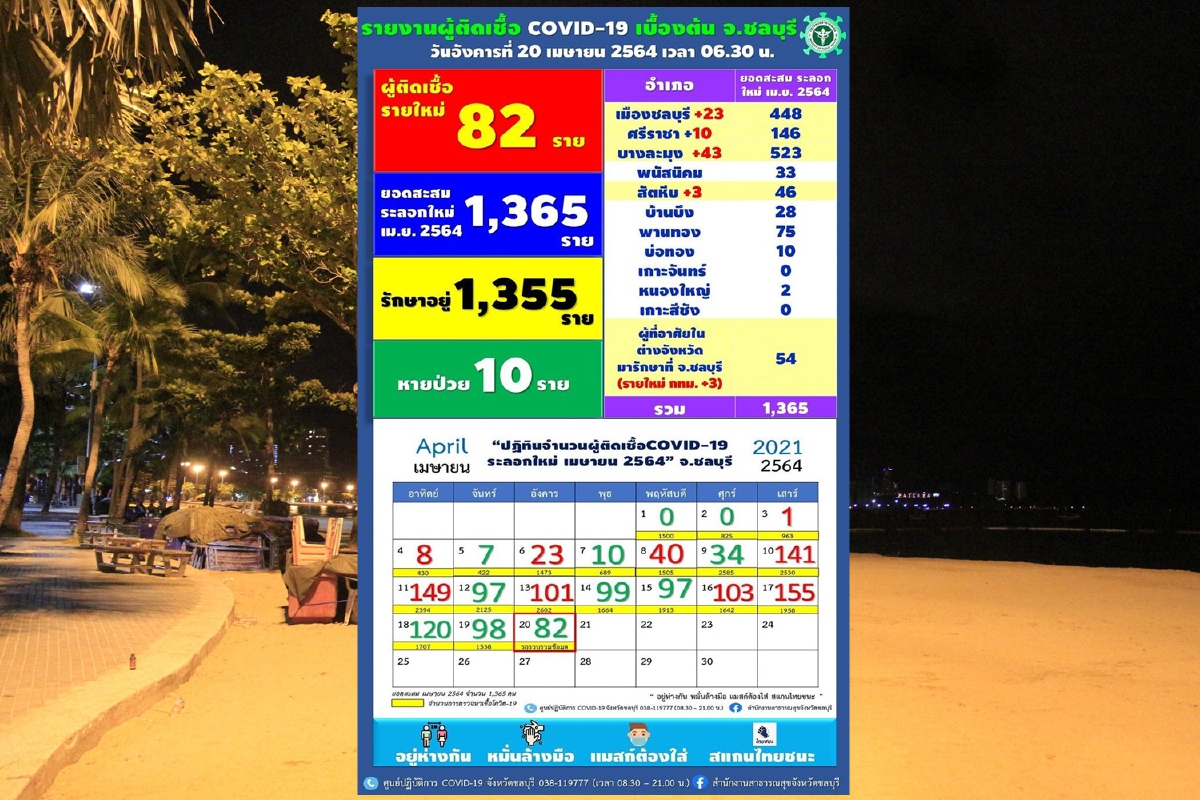 สำนักงานประชาสัมพันธ์ จังหวัดชลบุรี รายงานสถานการณ์การระบาดของไวรัสโควิด-19 ณ วันที่ 20 เม.ย. 64 เวลา 06.30 น. มีผู้ติดเชื้อรายใหม่ 82 ราย มาจาก