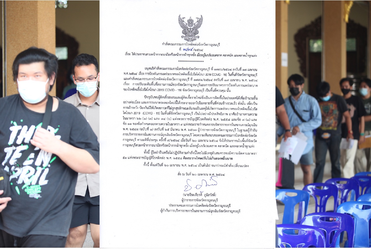เมื่อวันที่ 20 เมษายน นายจีระเกียรติ ภูมิสวัสดิ์ ผู้ว่าราชการจังหวัดกาญจนบุรี ประธานคณะกรรมการโรคติดต่อจังหวัดกาญจนบุรี ผู้กำกับการบริหารราชการในสถานการณ์ฉุกเฉินจังหวัดกาญจนบุรี ได้ออกประกาศคำสั่งคณะกรรมการโรคติดต่อจังหวัดกาญจนบุรี ที่ 1819/2564 เรื่อง ให้ประชาชนสวมหน้ากากอนามัยหรือหน้ากากผ้าทุกครั้ง เมื่ออยู่ในบริเวณตลาด ตลาดนัด และตลาดน้ำทุกแห่ง