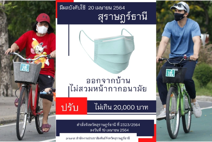 เมื่อวันที่ 21 เมษายน ศาลแขวงสุราษฎร์ธานี ได้ออกประกาศข่าวศาล จับจริง ปรับจริง โดยวันนี้พนักงานอัยการคดีศาลแขวงสุราษฎร์ธานี ได้ยื่นฟ้องผู้ฝ่าฝืนไม่สวมหน้ากากอนามัย เป็นผู้ชาย 1 ราย อายุ 37 ปีอาศัยในพื้นที่ อ.เมือง ตามคำสั่งจังหวัดสุราษฎร์ธานี ที่ 2323/2564 เรื่อง ให้ประชาชนในพื้นที่จังหวัดสุราษฎร์ธานี สวมหน้ากากอนามัย หรือหน้ากากผ้าทุกครั้งตลอดเวลาที่ออกนอกเคหสถานหรือสถานที่พำนักของตน ในฐานความผิดตามมาตรา 51 แห่งพระราช บัญญัติโรคติดต่อ พ.ศ. 2558 โดยศาลมีคำพิพากษาปรับ 4,000 บาท จำเลยให้การรับสารภาพลดโทษให้กึ่งหนึ่งคงปรับ 2,000 บาท