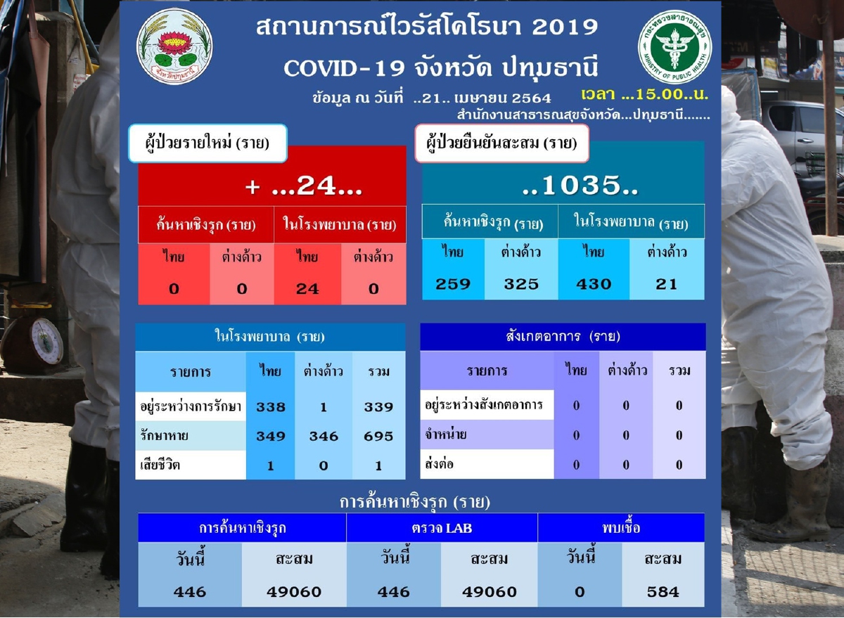 เมื่อวันที่ 21 เมษายน สำนักงานสาธารณสุขจังหวัดปทุมธานี รายงานสถานการณ์โรคติดเชื้อไวรัสโคโรนา 2019 (COVID-19) จังหวัดปทุมธานี ประจำวันที่ 21 เมษายน 2564 ณ เวลา 15.00 น.พบผู้ติดเชื้อรายใหม่จากระบบเฝ้าระวังและระบบบริการรวม 24 ราย รวมผู้ติดเชื้อโควิดในการระบาดระลอกใหม่รวม 1,035 ราย