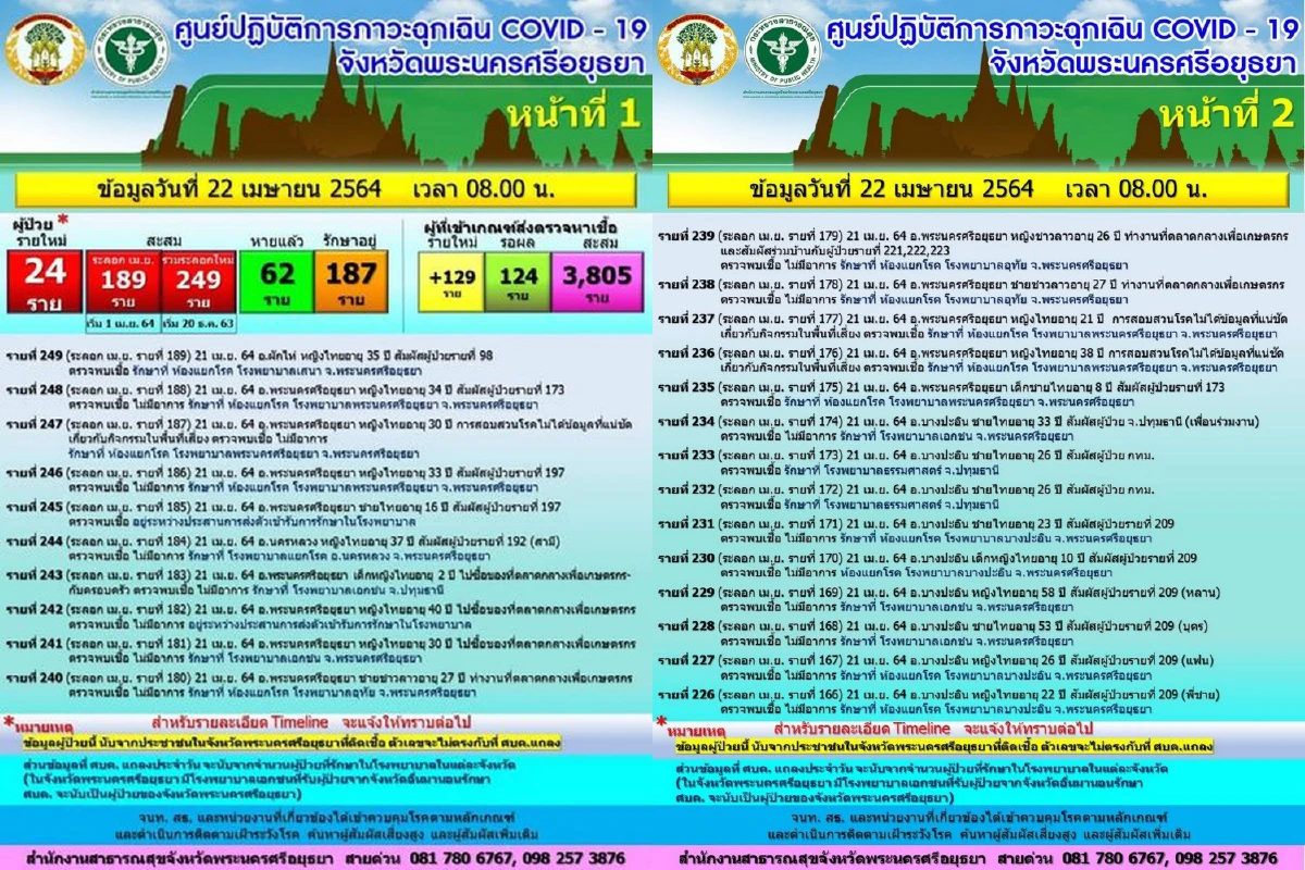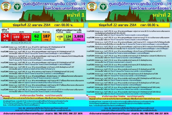 เมื่อวันที่ 22 เมษายน 64 จ.พระนครศรีอยุธยา เปิดเผยสถานการณ์แพร่ระบาดโรคโควิด-19 ว่าวันนี้พบผู้ติดเชื้อโควิดรายใหม่เพิ่มขึ้นอีก 24 คน รวมยอดติดเชื้อสะสมอยู่ที่ 249 คนเฉพาะเดือนเมษายนมียอดสะสม189 คนรักษาตัวจนหายขาดแล้ว 62 คนและยังต้องพักรักษาตัวไปในโรงพยาบาลอีก 187 คน