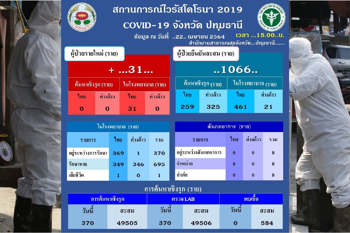รายงานสถานการณ์โรคติดเชื้อไวรัสโคโรนา 2019 (COVID-19) จังหวัดปทุมธานี ประจำวันที่ 22 เมษายน 2564 ผู้ติดเชื้อรายใหม่จากระบบเฝ้าระวังและระบบบริการ 31 ราย