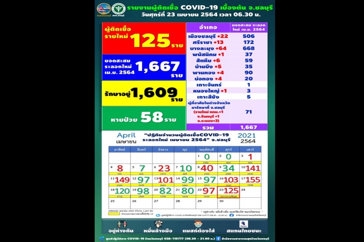 เมื่อวันที่ 23 เม.ย. 64 เพจเฟซบุ๊ก สำนักงานประชาสัมพันธ์จังหวัดชลบุรี - Chonburi PR รายงานว่าวันนี้มีรายงานผู้ติดเชื้อโควิด-19 รายใหม่ จำนวน 125 ราย