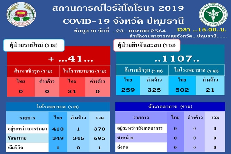 รายงานสถานการณ์โรคติดเชื้อไวรัสโคโรนา 2019 (COVID-19) จังหวัดปทุมธานี ประจำวันที่ 23 เมษายน 2564 ผู้ติดเชื้อรายใหม่จากระบบเฝ้าระวังและระบบบริการ 41 ราย