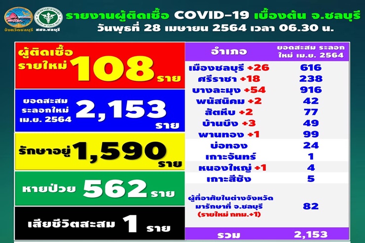 เมื่อวันที่ 28 เม.ย. 64 สำนักงานสาธารณสุขจังหวัดชลบุรี รายงานว่าวันนี้มีรายงานผู้ติดเชื้อโควิด-19 รายใหม่ จำนวน 108 ราย