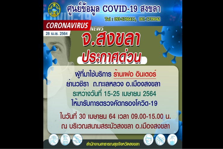 สำนักงานสาธารณสุขจังหวัดสงขลา ออกประกาศ ให้ผู้ใช้บริการ ร้านเฝอ อินเตอร์ ย่านวชิรา อำเภอเมืองสงขลา ระหว่างวันที่ 15-25 เม.ย.ที่ผ่านมา ให้มารับการตรวจคัดกรองหาเชื้อโควิด-19 ในวันที่ 30 เม.ย.64 ในเวลา 09.00-15.00 น.ที่ บริเวณสนามสระบัว แหลมสมิหลา อำเภอเมืองสงขลา หลังพบพนักงานติดเชื้อโควิด-19 เบื้องต้นมีรายงานพนักงาน 17 คน และมีผู้สัมผัสเสี่ยงกลุ่มลูกค้าประมาณ 400 คน โดยทางร้านได้ปิดทำความสะอาดฆ่าเชื้อตั้งแต่วันที่ 25 เม.ย.ที่ผ่านมา