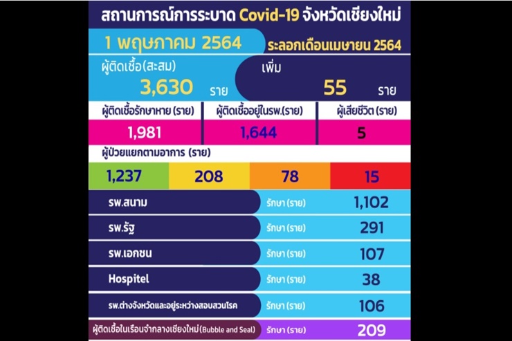 เมื่อวันที่ 1 พ.ค.2564 สำนักงานสาธารณสุขจังหวัดเชียงใหม่ รายงานสถานการณ์การแพร่ระบาดของโรคโควิด-19 ในพื้นที่จ.เชียงใหม่ ว่า วันนี้ พบผู้ติดเชื้อเพิ่ม 55 ราย รวมยอดสะสมการระลอกใหม่ 3,630 ราย มี ผู้เสียชีวิตเพิ่ม 3 ราย ทำให้ยอดผู้เสียชีวิตสะสมรวม 5 ราย โดยขณะนี้ มีผู้ป่วยรักษาตัวอยู่ในโรงพยาบาลทั้งสิ้น 1,644 ราย ประกอบด้วย โรงพยาบาลสนาม 1,102 ราย, โรงพยาบาลรัฐ 291 ราย, โรงพยาบาลเอกชน 107 ราย, ฮอสพิเทล 38 ราย, โรงพยาบาลต่างจังหวัดและอยู่ระหว่างการสอบสวนโรค 106 ราย และผู้ป่วยในเรือนจำกลางเชียงใหม่ 209 ราย