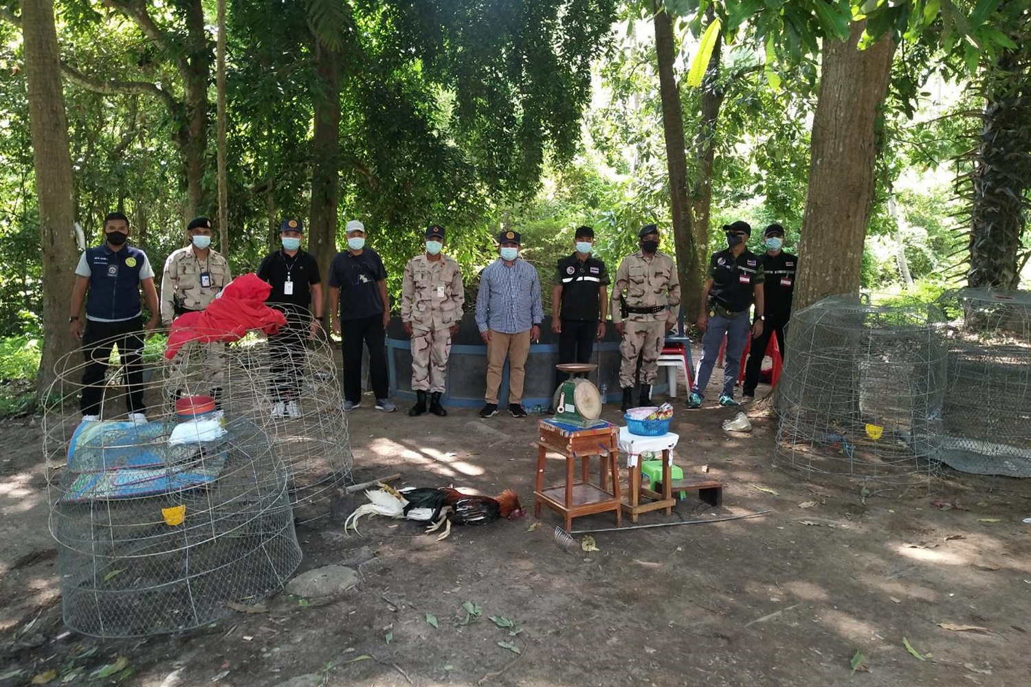 เมื่อเจ้าหน้าที่เดินทางไปถึงไม่พบนักพนัน พบแต่ซากไก่ 2 ตัวพร้อมอุปกรณ์การละเล่นพนันชนไก่หลายรายการ ประกอบด้วย สังเวียนแบบไม่ถาวร 1 ชุด ตาชั่ง 1 เครื่อง ซุ้มไก่ จำนวน 27 ซุ้ม โต๊ะสำหรับติดเดือยไก่ชน พรมไก่ 2 ผืน มุ้งไก่ 1 หัว เก้าอี้ 10 ตัวและเดือยไก่ 1 ข้าง จึงได้จัดทำบันทึกการตรวจยึดไว้เป็นหลักฐานเพื่อสืบสวนหาตัวผู้กระทำผิดมาดำเนินคดี ฐานร่วมกันชุมนุมหรือมั่วสุมลักษณะที่เสี่ยงต่อการแพร่เชื้อโรคอันผิดตามพ.ร.ก.สถานการณ์ฉุกเฉิน พ.ศ.2548และฝ่าฝืนคำสั่งจังหวัดสุราษฎร์ธานีที่ 2521/2564 เรื่องมาตรการเร่งด่วนในการป้องกันการแพร่ระบาดโควิด -19
