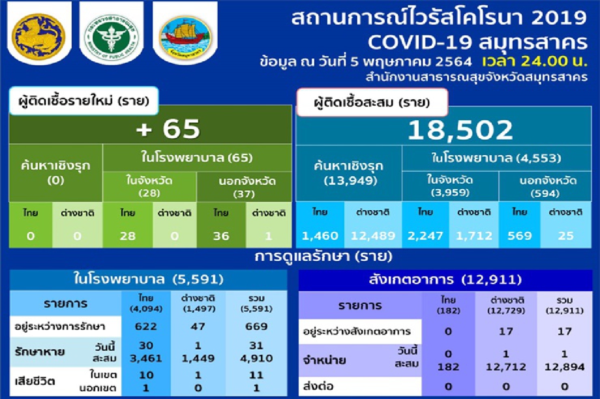 เมื่อวันที่ 6 พค. 64 จังหวัดสมุทรสาคร รายงานข้อมูลจำนวนผู้ติดเชื้อโควิด-19 ณ เวลา 24.00 น. วันที่ 5 พค.64 พบผู้ติดเชื้อรายใหม่ 65 ราย เป็นการพบจากการตรวจในโรงพยาบาลทั้ง 65 ราย เป็นคนในจังหวัด 28 ราย เป็นคนไทย 28 ราย และคนนอกจังหวัด37 ราย เป็นคนไทย 36 ราย และ ต่างชาติ 1 ราย รวมยอดผู้ติดเชื้อโควิด-19 สะสมในจังหวัดสมุทรสาคร นับตั้งแต่มีการระบาดรอบใหม่อยู่ที่ 18,502 ราย ผู้เสียชีวิตสะสม 12 ราย ยังรักษาตัวอยู่ 686 ราย
