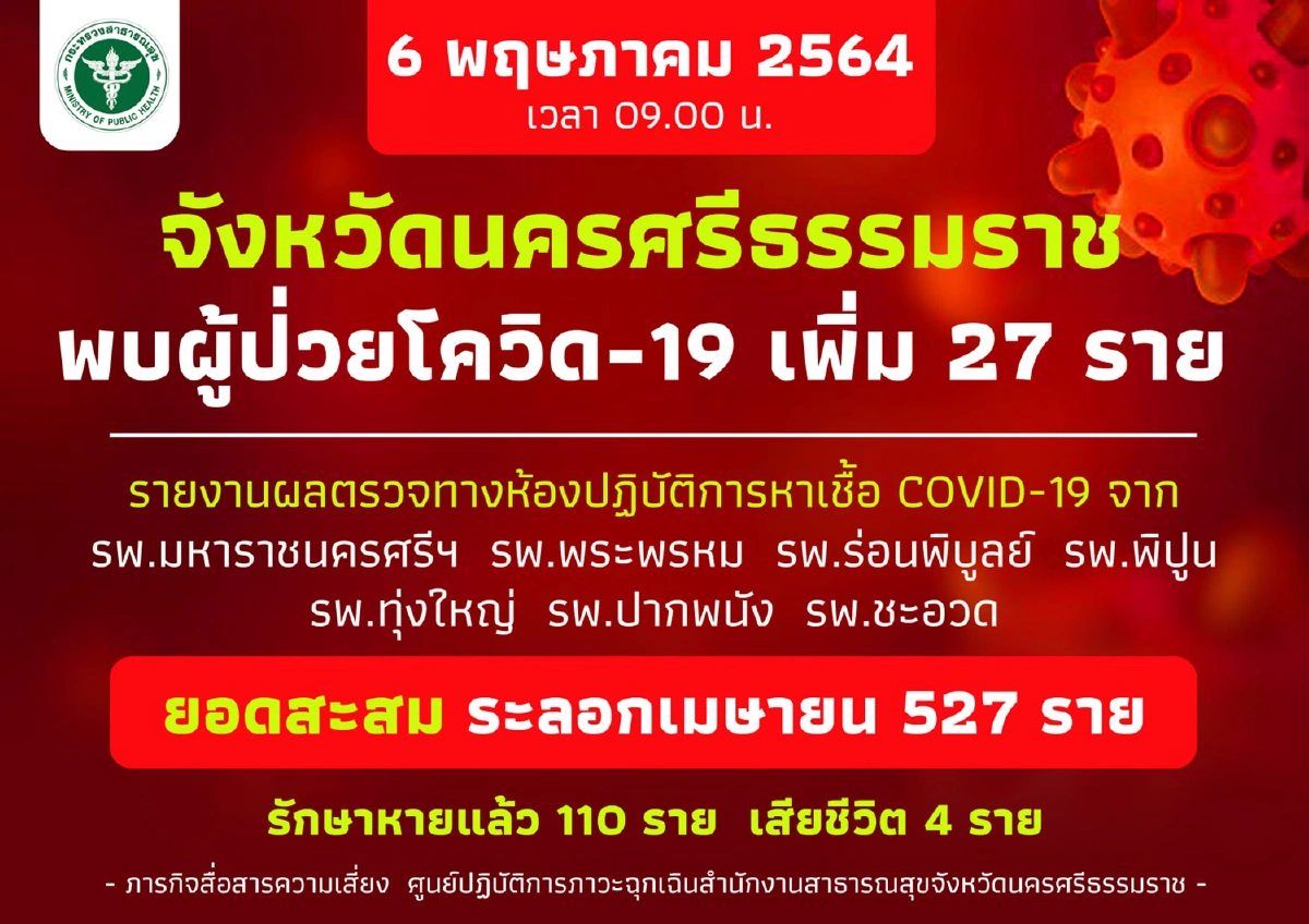 นครศรีธรรมราช-โควิดนครศรีฯตายเพิ่ม1เป็นหญิงวัย69รับเชื้อจากคลัสเตอร์ไหว้ครูมโนราห์อ.ชะอวดเชื่อมโยงสำนักทรงเจ้าพัทลุง ป่วยสะสม 527รักษาหาย110