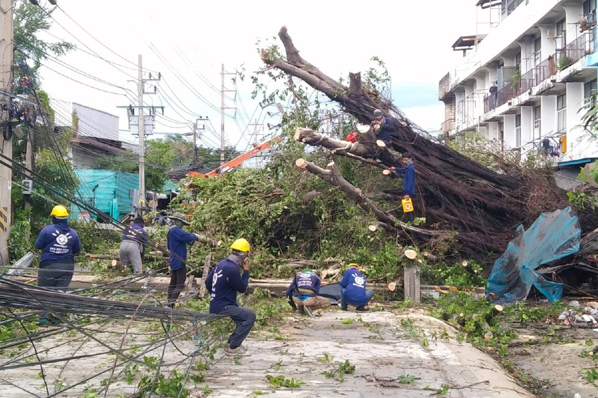 สมุทรปราการ-ส่องสภาพความเสียหายหลังเกิดพายุกระหน่ำเมืองปากน้ำ เสาไฟฟ้าหักโค่น ต้นไม้ใหญ่ล้มทับรถชาวบ้าน หลังคาปลิวหาย
