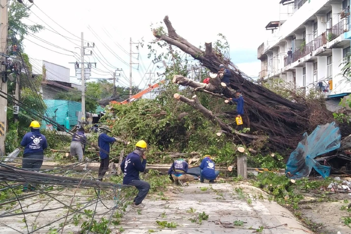พายุกระหน่ำเมืองปากน้ำหลังเสาไฟฟ้าหักโค่นต้นไม้ล้มทับรถชาวบ้าน