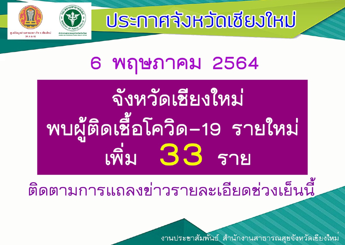 สถานการณ์ของผู้ติดเชื้อไวรัสโควิด-19 รายใหม่ของเดือนพฤษภาคม 2564 วันนี้สำนักงานสาธารณสุขจังหวัดเชียงใหม่ เผยตัวเลขเพิ่มจำนวน 33 ราย ยังทรงตัวที่อยู่ต่ำกว่าร้อยมาต่อเนื่องมีแนวโน้ม?ลดลง? ยอดสะสมทั้งหมดจำนวน 3,822 ราย มีผู้รักษาหายแล้วจำนวน 2,829 ราย
