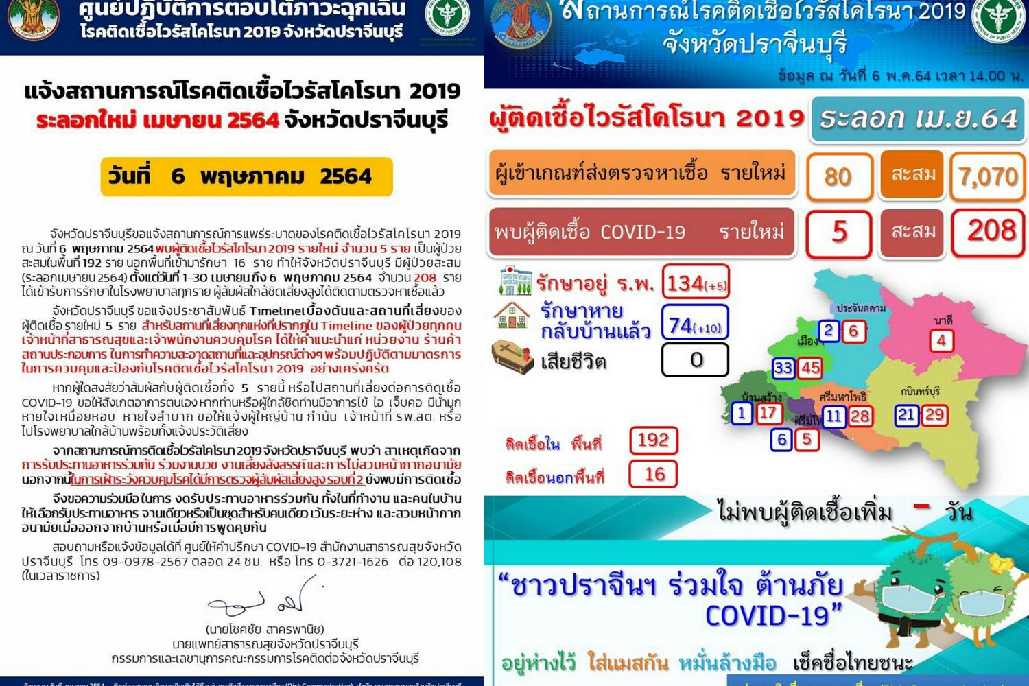 นพ.โชคชัย สาครพานิช นายแพทย์สาธารณสุข จ.ปราจีนบุรี ได้มีแจ้งสถานการณ์โรคติดเชื้อไวรัสโคโรนา 2019 ระลอกใหม่ เมษายน 2564 จังหวัดปราจีนบุรีวันนี้พบผู้ติดเชื้อไวรัสโคโรนา 2019 รายใหม่ จำนวน 5 ราย เป็นผู้ป่วย สะสมในพื้นที่ 192 ราย นอกพื้นที่เข้ามารักษา 16 ราย ทำให้จังหวัดปราจีนบุรี มีผู้ป่วยสะสม (ระลอกเมษายน2564) ตั้งแต่วันที่ 30 เมษายนถึง 6 พฤษภาคม 2554 จำนวน 208 ราย ได้เข้ารับการรักษาในโรงพยาบาลทุกราย ผู้สัมผัสใกล้ชิดเสี่ยงสูงได้ติดตามตรวจหาเชื้อแล้ว