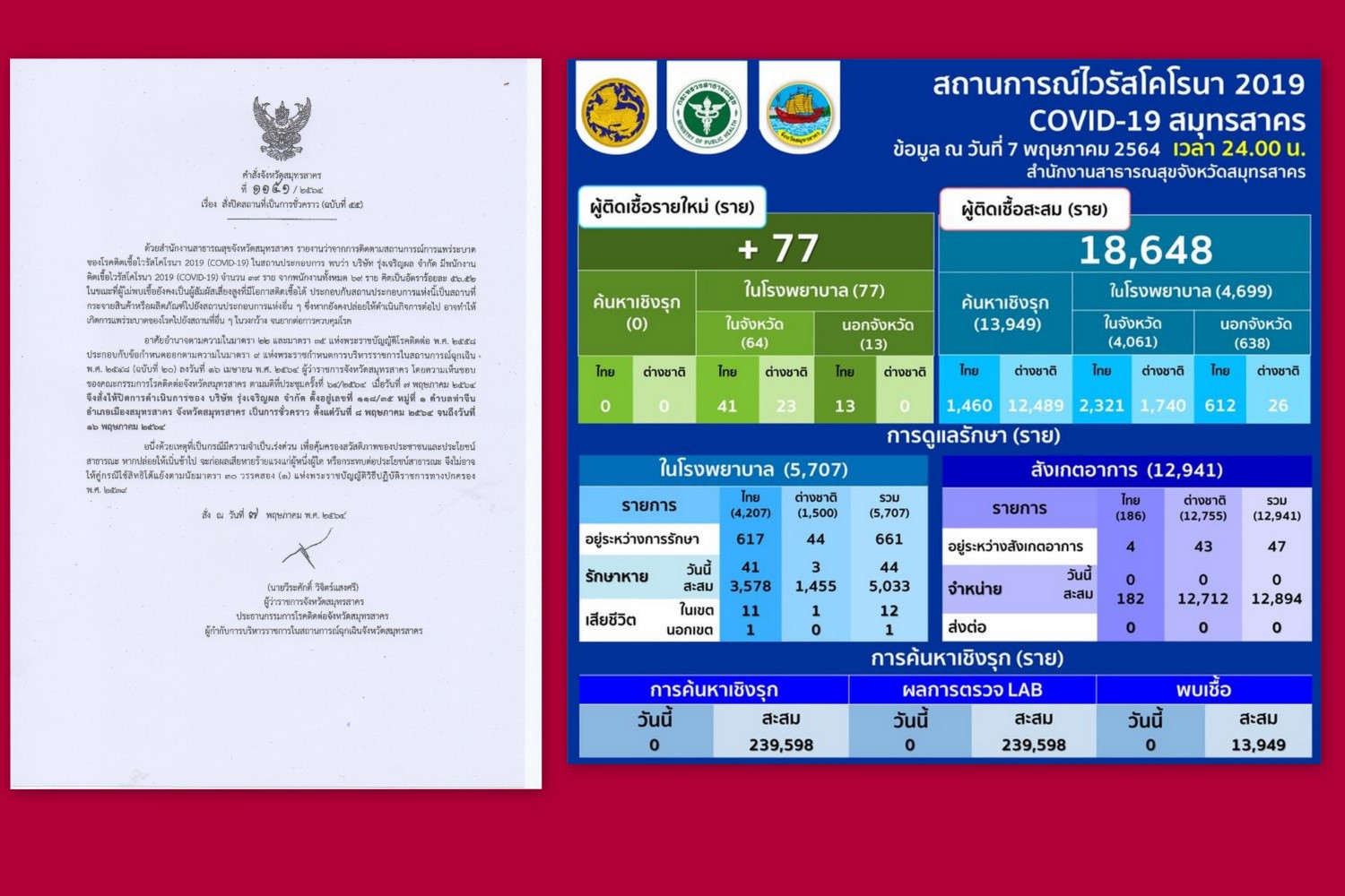 ขณะที่จังหวัดสมุทรสาคร รายงานข้อมูลจำนวนผู้ติดเชื้อโควิด-19 ณ เวลา 24.00 น. วันที่ 7 พค.64 พบผู้ติดเชื้อรายใหม่ 77 ราย เป็นการพบเชื้อจากการตรวจในโรงพยาบาลทั้ง 77 ราย เป็นคนในจังหวัด 64 ราย นอกจังหวัด 13ราย เป็นคนไทยในจังหวัด 41 ราย ต่างชาติ23ราย รวมยอดผู้ติดเชื้อโควิด-19 สะสมในจังหวัดสมุทรสาคร นับตั้งแต่มีการระบาดรอบใหม่อยู่ที่18,648 ราย ผู้เสียชีวิตสะสม 12 ราย
