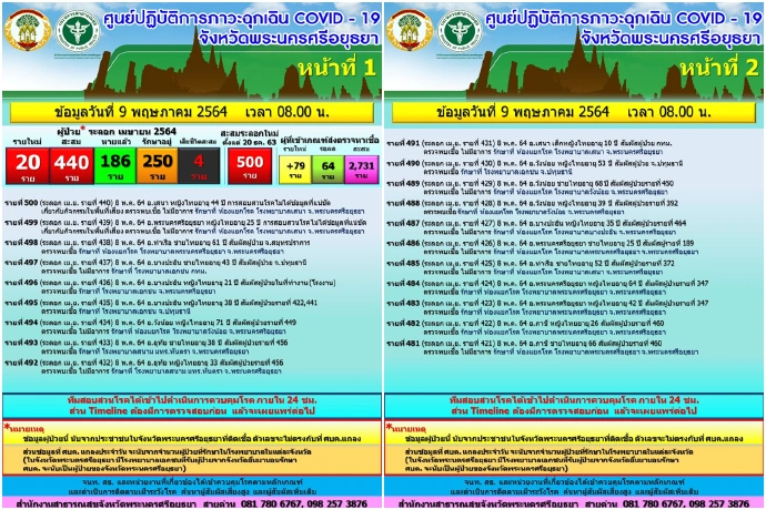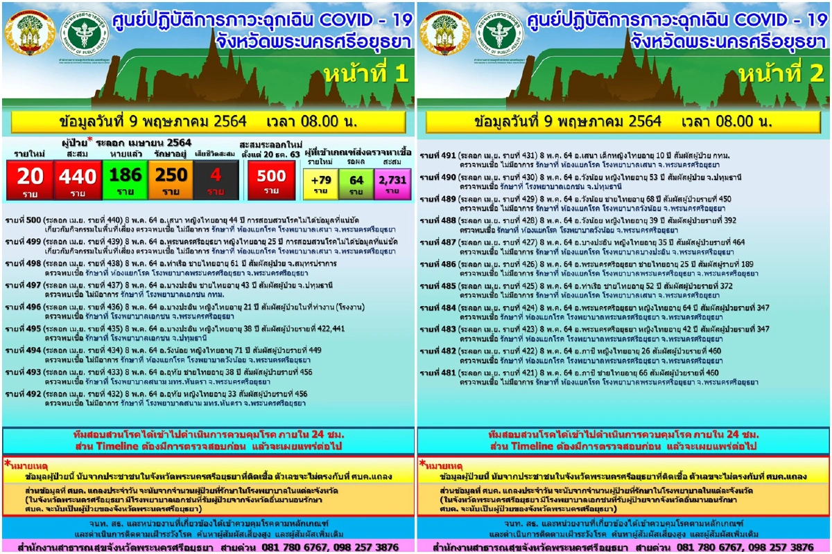 เมื่อวันที่ 9 พฤษภาคม นายภานุ แย้มศรี  ผู้ว่าราชการจังหวัดพระนครศรีอยุธยา เผยแพร่ข้อมูลอย่างเป็นทางการ เพื่อแจ้งถึงทุกหน่วยงาน   และประชาชนในพื้นที่ว่า ในวันนี้พบผู้ติดเชื้อโควิดรายใหม่ของจังหวัดเพิ่มขึ้นอีก 20 คน ทำให้ยอดผู้ป่วยติดเชื้อสะสมระลอกที่ 2 รวมอยู่ที่ 500 คน และมีผู้เสียชีวิตสะสมรวม 4 คน โดยมีผู้ป่วยติดเชื้อที่ยังคงพักรักษาตัวไปในโรงพยาบาลอีก 250 คน ขณะที่มีกลุ่มเป้าหมายสุ่มเสี่ยงสูงจะติดเชื้ได้ส่งไปตรวจหาเชื้อแล้วอยู่ระหว่างรอผลตรวจสอบอย่างเป็นทางการอีก 64 คน