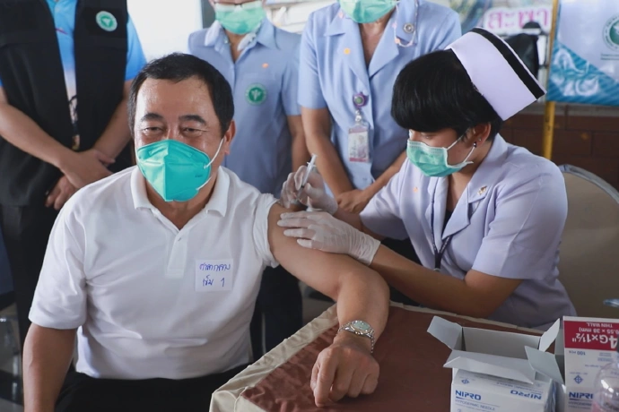 กาญจนบุรี-ผู้ว่าฯกาญจน์นำฉีดวัคซีนป้องกันโควิดชนิดซิโนแวคเข็มแรก ส่งอสม.เคาะประตูบ้านชวนผู้สูงอายุและกลุ่มเสี่ยง7โรคลงทะเบียน ที่อ.เมืองกาญจนบุรี