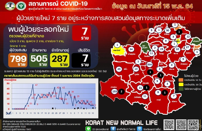 เมื่อวันที่ 15พ.ค.64 ที่ประชุมคณะกรรมการโรคติดต่อจังหวัดนครราชสีมา ได้แถลงสถานการณ์การแพร่ระบาดของไวรัสโควิด-19 ในพื้นที่ จ.นครราชสีมาว่า ล่าสุดวันนี้ตรวจพบผู้ติดเชื้อเพิ่มอีก 7 ราย โดยพบอยู่ในพื้นที่ อ.เมืองนครราชสีมา 3 ราย อ.ชุมพวง 2 ราย อ.ปากช่อง 1 ราย และ อ.จักราช 1 ราย รวมผู้ป่วยสะสมในระลอกใหม่นี้ จำนวน 799 ราย รักษาหายแล้ว จำนวน 505 ราย ยังรักษาอยู่ จำนวน 287 ราย