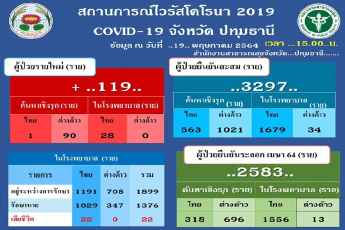 สำนักงานสาธารณสุขจังหวัดปทุมธานี รายงานสถานการณ์โรคติดเชื้อไวรัสโคโรนา 2019 (COVID-19) จังหวัดปทุมธานี ประจำวันที่ 19 พฤษภาคม 2564 ณ เวลา 15.00 น.พบผู้ติดเชื้อรายใหม่ 119 ราย จากระบบเฝ้าระวังและระบบบริการ 28 ราย และจากการค้นหาเชิงรุก 91 ราย รวมผู้ติดเชื้อโควิดในการระบาดระลอกใหม่รวม 3,297 ราย และเสียชีวิตอีก 2 ราย รวม 22 ราย