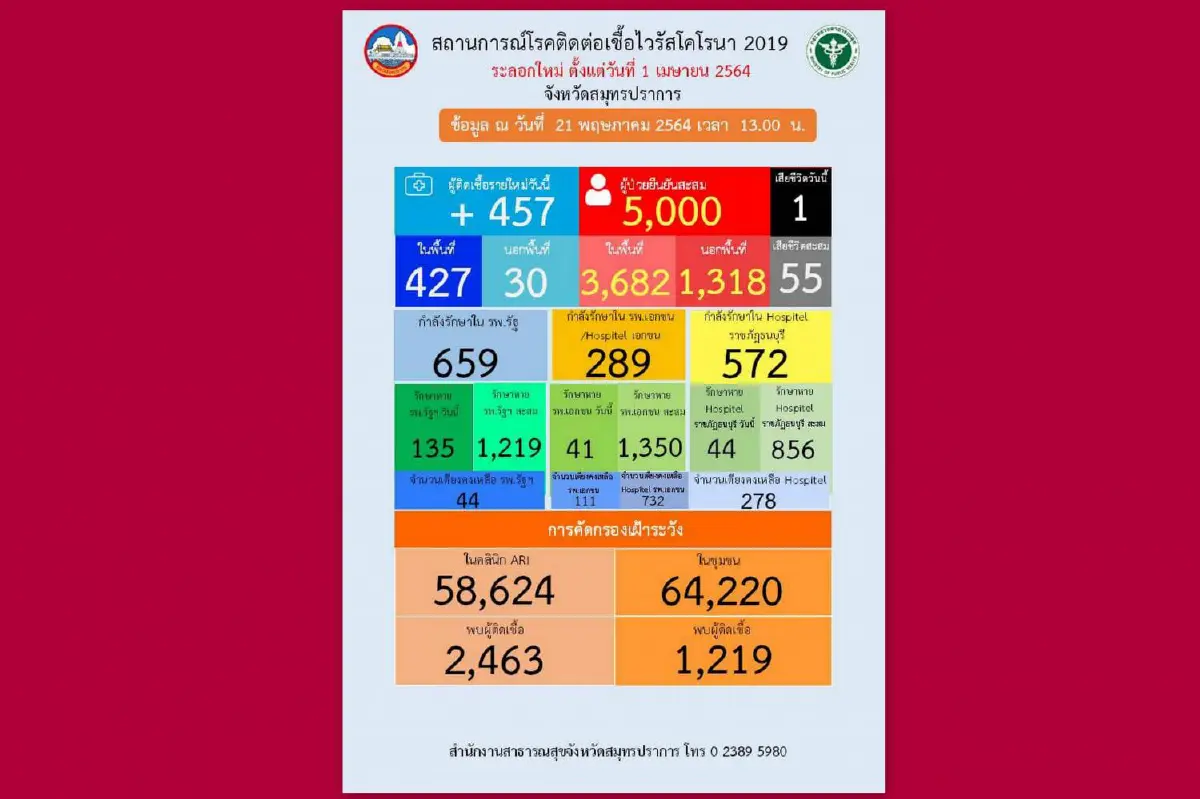 เมื่อวันที่ 21 พ.ค. 2564 นายวันชัย คงเกษม ผู้ว่าราชการจังหวัดสมุทรปราการแถลงสถานการณ์โควิด-19ว่า พบผู้ติดเชื้อวันนี้ จำนวน 457 ราย เป็นผู้ป่วยในพื้นที่จำนวน 427 ราย อำเภอเมืองสมุทรปราการจำนวน 357 ราย อำเภอพระประแดงจำนวน 40 ราย อำเภอพระสมุทรเจดีย์จำนวน 3 ราย อำเภอบางพลีจำนวน 15 ราย อำเภอบางบ่อจำนวน 3 ราย อำเภอบางเสาธงจำนวน 9 รายโรงพยาบาลเอกชนรับมารักษาต่อในสมุทรปราการจำนวน 30 ราย เสียชีวิต 1 ราย เป็นชายไทยอายุ72 ปี ประวัติเสี่ยง เป็นผู้สัมผัสผู้ป่วยยืนยัน โรคประจำตัว ไตเรื้อรังที่อยู่ขณะป่วย ต.บางกอบัว อ.พระประแดง ส่วนเตียงผู้ป่วยหนักหรือห้องไอซียู ในโรงพยาบาลรัฐจำนวน 80 เตียงใช้ไปแล้ว 79 เตียง เหลือเพียง 1 เตียง