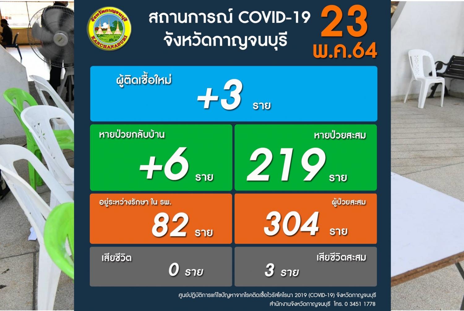 เมื่อวันที่ 23 พ.ค.สำนักงานสาธารณสุขจังหวัดกาญจนบุรี รายงานสถานการณ์การติดเชื้อโควิด-19 ในพื้นที่จังหวัดกาญจนบุรีว่า พบผู้ติดเชื้อรายใหม่ จำนวน 3 ราย รวมป่วยติดเชื้อสะสม จำนวน 304 ราย หายป่วย 6 ราย สะสม จำนวน 219 ราย อยู่ระหว่างรักษาอยู่โรงพยาบาล จำนวน 82 ราย เสียชีวิตสะสม จำนวน 3 ราย สำหรับผู้ป่วยรายใหม่ที่พบเชื้อ จำนวน 3 ราย เป็นรายที่ 302-304 ข้อมูลของผู้ติดเชื้อทั้ง 3 รายดังนี้