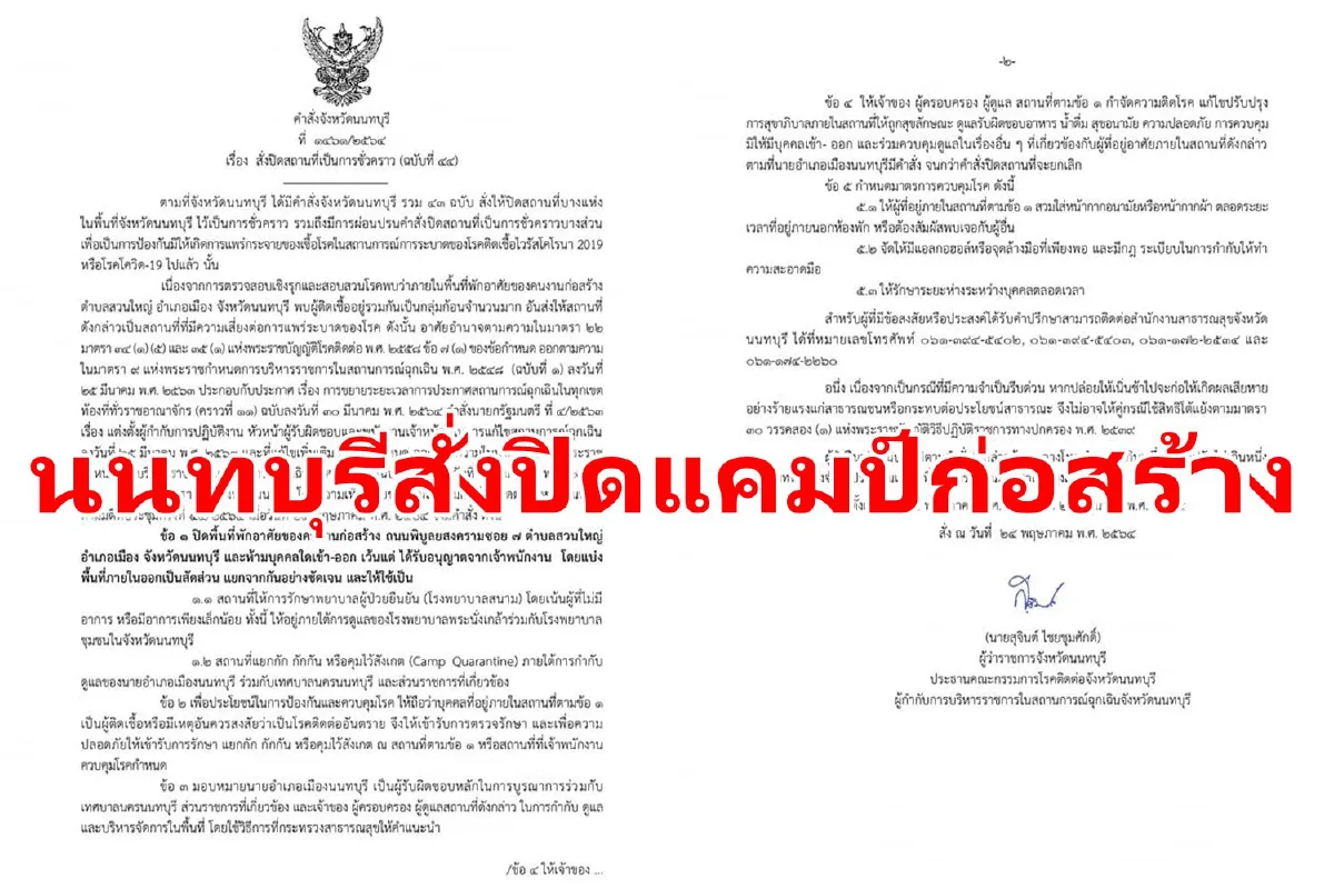 จังหวัดนนทบุรีได้ออกคำสั่งลงวันที่ 24 พ.ค. 64 ให้ปิดพื้นที่พักอาศัยของคนงานก่อสร้าง ถนนพิบูลยสงคราม ซอย 7 ตำบลสวนใหญ่ อำเภอเมือง จังหวัดนนทบุรี และห้ามบุคคลใดเข้า-ออก เว้นแต่ ได้รับอนุญาตจากเจ้าพนักงาน โดยแบ่งพื้นที่ภายในออกเป็นสัดส่วน แยกจากกันอย่างชัดเจน หลังจากพบผู้ติดเชื้อโควิด-19 เป็นกลุ่มก้อนในพื้นที่