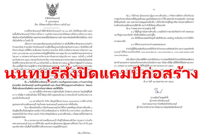 นนทบุรีสั่งปิดแคมป์คนงานก่อสร้างในพื้นที่ ต.สวนใหญ่ อ.เมือง หลังพบการติดเชื้อโควิดเป็นกลุ่มก้อน และให้จัดพื้นที่เป็น รพ.สนาม เพื่อรักษาผู้ป่วยยืนยันเน้นผู้ไม่มีอาการหรือมีอาการเพียงเล็กน้อย