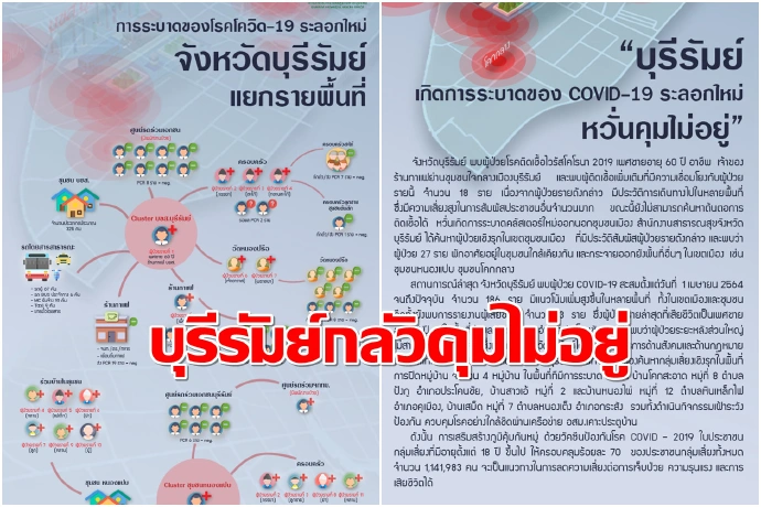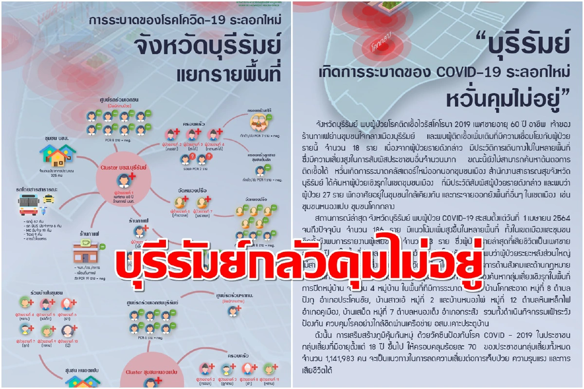 เมื่อวันที่ 25 พฤษภาคม สำนักงานสาธารณสุขจังหวัดบุรีรัมย์ ได้เผยแพร่ข้อมูลประชาสัมพันธ์ผ่านเพจ เฟซบุ๊ก สสจ.บุรีรัมย์ ระบุว่า “บุรีรัมย์ เกิดการระบาดของ COVID-19 ระลอกใหม่ หวั่นคุมไม่อยู่ จังหวัดบุรีรัมย์ พบผู้ป่วยโรคติดเชื้อไวรัสโคโรนา 2019 เพศชาย อายุ 60 ปี อาชีพ เจ้าของร้านกาแฟย่านชุมชนใจกลางเมืองบุรีรัมย์ และพบผู้ติดเชื้อเพิ่มเติมที่มีความเชื่อมโยงกับผู้ป่วยรายนี้ จำนวน 18 ราย เนื่องจากผู้ป่วยรายดังกล่าว มีประวัติการเดินทางไปในหลายพื้นที่ ซึ่งมีความเสี่ยงสูงในการสัมผัสกับประชาชนอื่นจำนวนมาก ขณะนี้ยังไม่สามารถค้นหาต้นตอการติดเชื้อได้ หวั่นเกิดการระบาดคลัสเตอร์ใหม่ออกนอกชุมชนเมือง