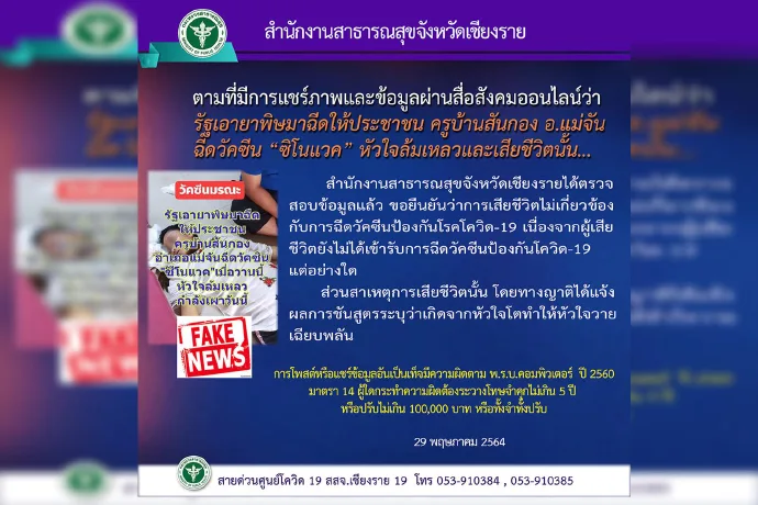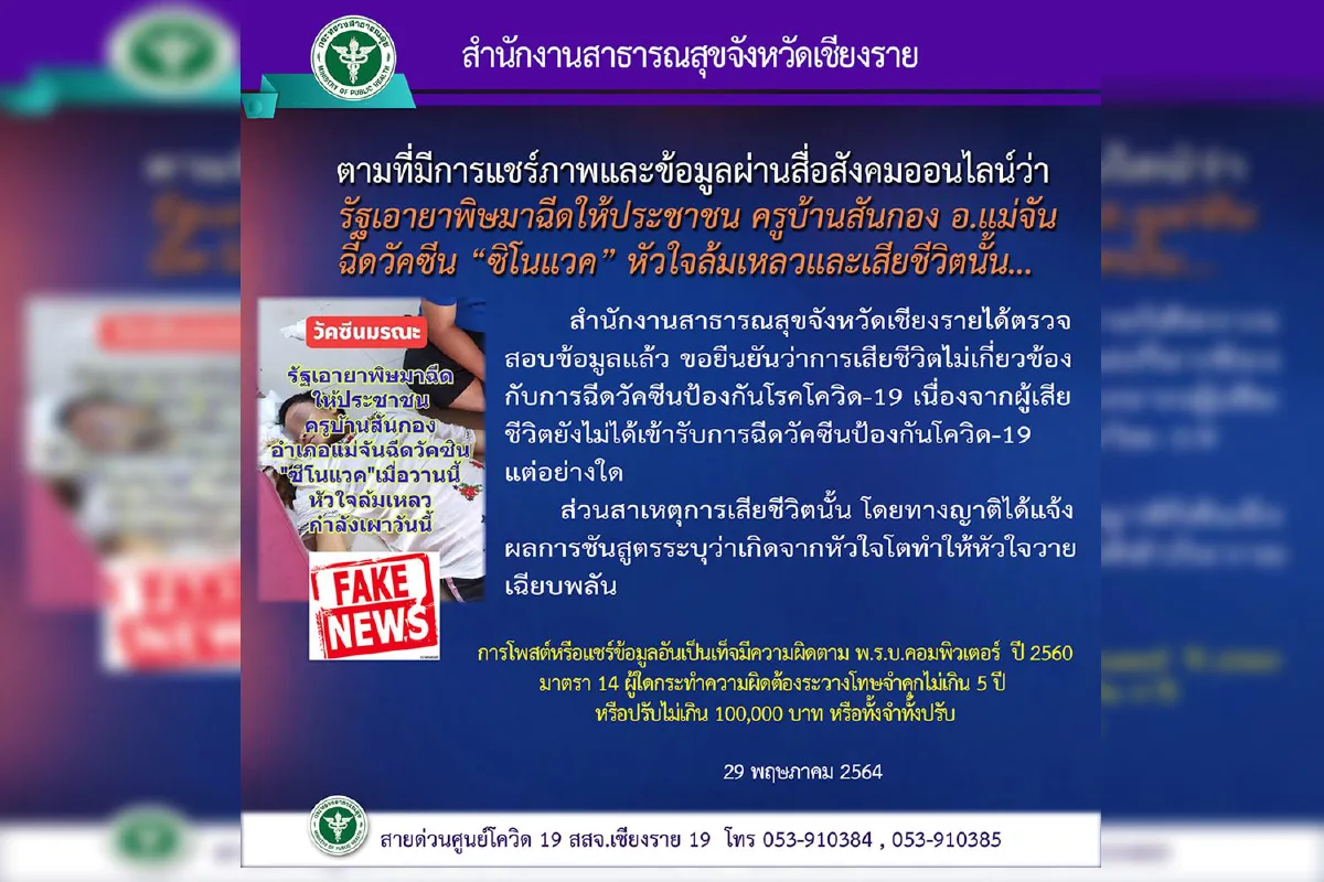 สำนักงานสาธารณสุขจังหวัดเชียงราย ชี้แจงครูบ้านสันกอง เสียชีวิตจากหัวใจวายเฉียบพลัน ยังไม่เคยเข้ารับการฉีดวัคซีนโควิด หลังสังคมออนไลน์อ้างข้อมูลมั่วตายหลังฉีด