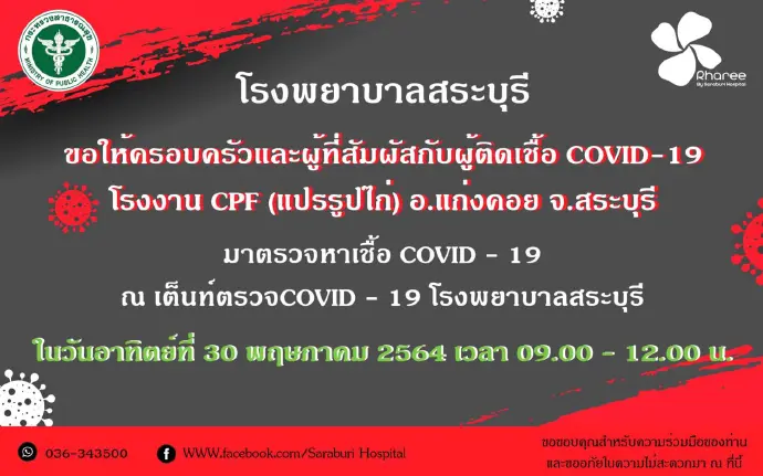 3.โรงงานแปรรูปเนื้อไก่สระบุรี (บริษัท ซีพีเอฟ ประเทศไทยจำกัด มหาชน) ได้เตรียมการจัดตั้งโรงพยาบาลสนามในพื้นที่ของบริษัทฯ โดยคาดว่าจะสามารถรองรับผู้ติดเชื้อได้ประมาณ 400 ราย