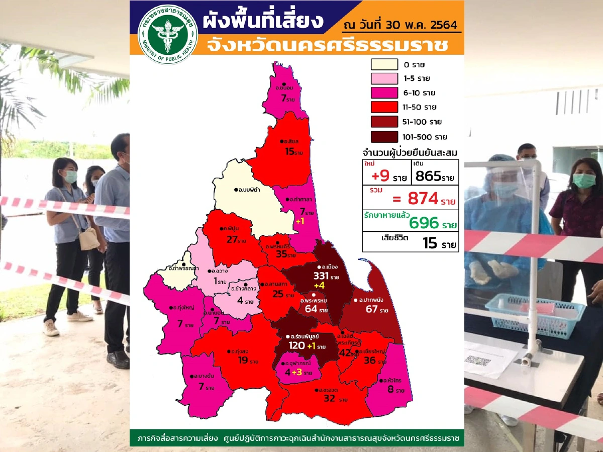 เมื่อวันที่ 30 พ.ค. สถานการณ์โรคโควิด-19 ในจ.นครศรีธรรมราช ล่าสุดติดเชื้อเพิ่ม 9 ราย รวมยอดสะสมระลอกเดือนเมษายน 2564 จำนวน 874 ราย รักษาหายแล้ว 696 ราย เสียชีวิต 15 ราย ซึ่งผู้เสียชีวิตรายล่าสุดเป็นหญิงอายุ 78 ปี ติดจากหลานชายคลัสเตอร์วงพนันในงานบวช พื้นที่ ต.เสาธง อ.ร่อนพิบูลย์ และอยู่ในกลุ่มเฝ้าระวังความเสี่ยงสูง รักษาตัวเมื่อ 3 พ.ค.64 มีโรคประจำตัวหลายโรค
