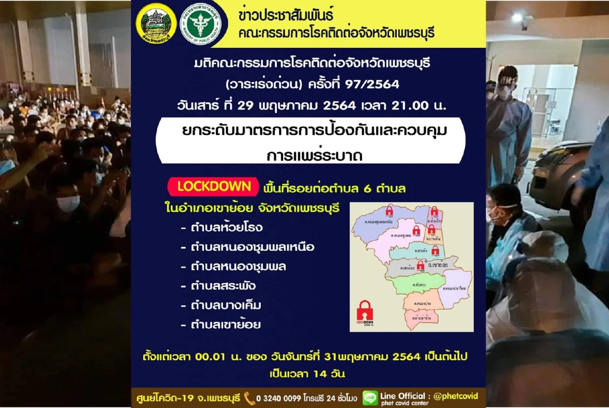 ทั้งนี้ ล่าสุดมติคณะกรรมการโรคติดต่อจังหวัดเพชรบุรี ได้ประชุมวาระเร่งด่วน ครั้งที่ 97/2564 เมื่อวันเสาร์ ที่ 29 พฤษภาคม 2564 เวลา 21.00 น. ได้มีการยกระดับมาตรการการป้องกันและควบคุมการแพร่ระบาดโดยประกาศ LOCKDOWN พื้นที่รอยต่อตำบล 6 ตำบล ในอ.เขาย้อย (ตำบลห้วยโรง ตำบลหนองชุมพลเหนือ ตำบลหนองชุมพล ตำบลสระพัง ตำบลบางเค็ม และตำบลเขาย้อย) ตลอดเวลา 24 ชั่วโมง ตั้งแต่เวลา 00.01 น. ของวันจันทร์ที่ 31 พฤษภาคม 2564 เป็นต้นไป เป็นเวลา 14 วัน