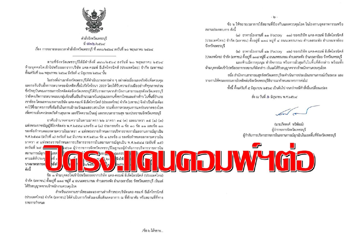 เมื่อวันที่ 1 มิ.ย นายภัคพงศ์ ทวิพัฒน์ ผวจ.เพชรบุรี ได้ออกคำสั่งจังหวัดเพชรบุรีที่ 871/2564 ลงวันที่ 1 มิ.ย.2564 ขยายระยะเวลาการบังคับบางมาตรการ ตามคำสั่งจังหวัดเพชรบุรี ที่ 790/2564 1.ห้ามบุคคลใดเข้าไปหรือออกจากบริษัท แคล-คอมพ์ อีเล็คโทรนิคส์ (ประเทศไทย) จำกัด (มหาชน) เว้นแต่ได้รับอนุญาตจากเจ้าพนักงานควบคุมโรค สำหรับแรงงานชาวไทยและแรงงานต่างด้าวของบริษัทฯ ให้ดำเนินการกักตัวเองเพื่อสังเกตอาการ ณ ที่พักอาศัย หรือสถานที่ที่ทาง ราชการกำหนด
