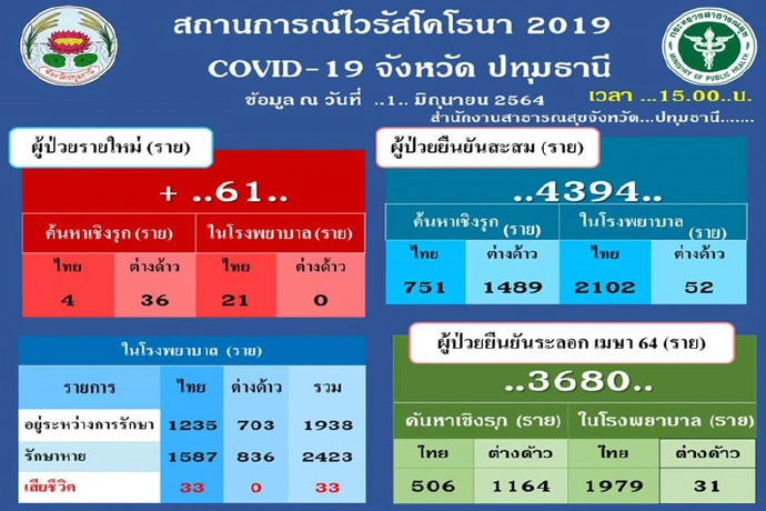 สำนักงานสาธารณสุขจังหวัดปทุมธานี รายงานสถานการณ์โรคติดเชื้อไวรัสโคโรนา 2019 (COVID-19) จังหวัดปทุมธานี ประจำวันที่ 1 มิถุนายน 2564 ณ เวลา 15.00 น.พบผู้ติดเชื้อรายใหม่ 61 ราย จากระบบเฝ้าระวังและระบบบริการ 21 ราย และจากการค้นหาเชิงรุก 40 ราย รวมผู้ติดเชื้อโควิดในการระบาดระลอกใหม่รวม 4,394 ราย และเสียชีวิตอีก 1 ราย รวม 33 ราย