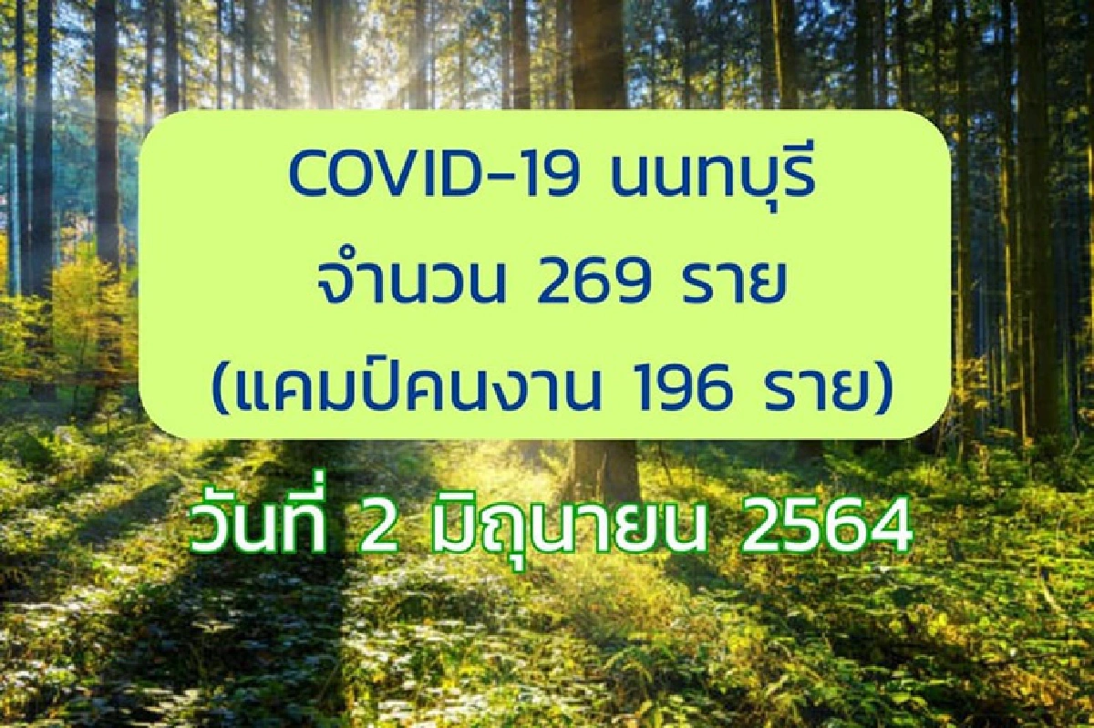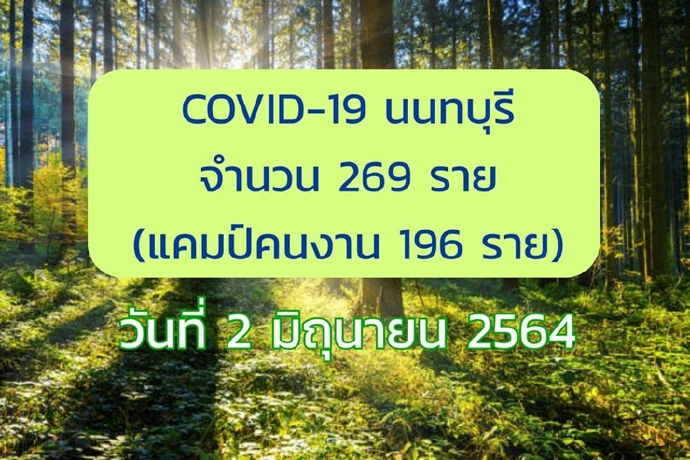 ศูนย์ข้อมูล COVID-19 นนทบุรี รายงาน สถานการณ์ โควิด-19 จังหวัดนนทบุรี ประจำวันที่ 2 มิถุนายน 2564 พบผู้ป่วยยืนยันอีก จำนวน 269 ราย (แคมป์คนงาน 3 แห่ง ใน อ.ปากเกร็ด 196 ราย ,ในรพ. 73 ราย ) แบ่งออกเป็น หญิง 68 ราย และชาย 201 ราย เป็นต่างชาติ139 ราย (พม่า 138 รายกัมพูชา1 ราย ) พบมีอาการ 31 ราย และไม่แสดงอาการอีก 238 ราย ส่วนใหญ่ติดเชื้อ แคมป์คนงาน สถานที่ทำงาน ตลาด และครอบครัว ซึ่งสามารถแบ่งออกตามภูมิลำเนา ได้ดังนี้