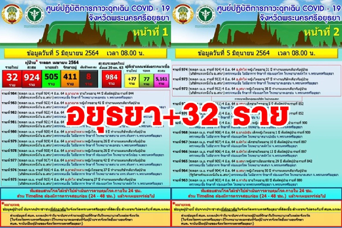 เมื่อวันที่ 5 มิ.ย. 64 นพ.พีระ อารีรัตน์ นายแพทย์สาธารณสุข จ.พระนครศรีอยุธยา เปิดเผยว่า ในวันนี้พบผู้ติดเชื้อโควิดรายใหม่ เพิ่มขึ้นอีก 32 คน ทำให้มียอดผู้ป่วยติดเชื้อสะสม รวมอยู่ที่ 984 คนแล้ว และยังต้องรักษาตัวต่อไปในโรงพยาบาลอีก 411 คน โดยมียอดผู้เสียชีวิตสะสม 8 คนเท่านั้น