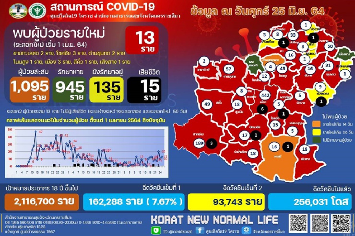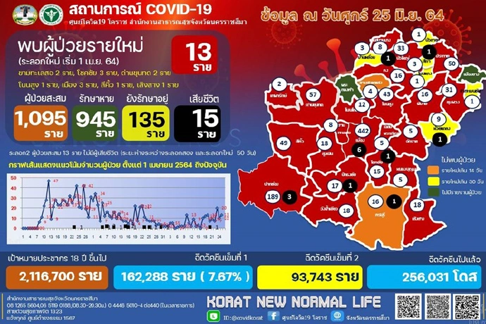 เมื่อวันที่ 25 มิ.ย. 64 นพ.นรินทร์รัชต์ พิชญคามินทร์ นายแพทย์สาธารณสุขจังหวัดนครราชสีมา เปิดเผยสถานการณ์การแพร่ระบาดของโรคโควิด-19 ในพื้นที่ จ.นครราชสีมา ว่า ล่าสุดวันนี้มีผู้ติดเชื้อเพิ่ม 13 ราย โดยพบอยู่ในพื้นที่ อ.ขามทะเลสอ 2 ราย, อ.โชคชัย 3 ราย, อ.ด่านขุนทด 2 ราย, อ.โนนสูง 1 ราย, อ.เมือง 3 ราย, อ.สีคิ้ว 1 ราย และ อ.เสิงสาง 1 ราย นอกจากนี้ก็มีผู้ป่วยเสียชีวิตอีก 1 ราย โดยเป็นชายอายุ 46 ปี ชาว ต.คลองม่วง อ.ปากช่อง จ.นครราชสีมา ซึ่งพบมีปัจจัยเสี่ยงป่วยเป็นโรคตับอักเสบจากแอลกอฮอลล์ สาเหตุการติดเชื้อ มีประวัติเดินทางมาจากพื้นที่เสี่ยง กทม. วันที่ 18 มิ.ย. 64 ตรวจพบเชื้อ เข้ารักษาที่ รพ.ปากช่องนานา ก่อนที่จะเสียชีวิตลงเมื่อคืนวันที่ 24 มิ.ย. 64 ที่ผ่านมา รวมผู้ป่วยสะสมขณะนี้ จำนวน 1,095 ราย รักษาหายแล้ว จำนวน 945 ราย ยังรักษาอยู่ จำนวน 135 ราย และเสียชีวิต 15 ราย