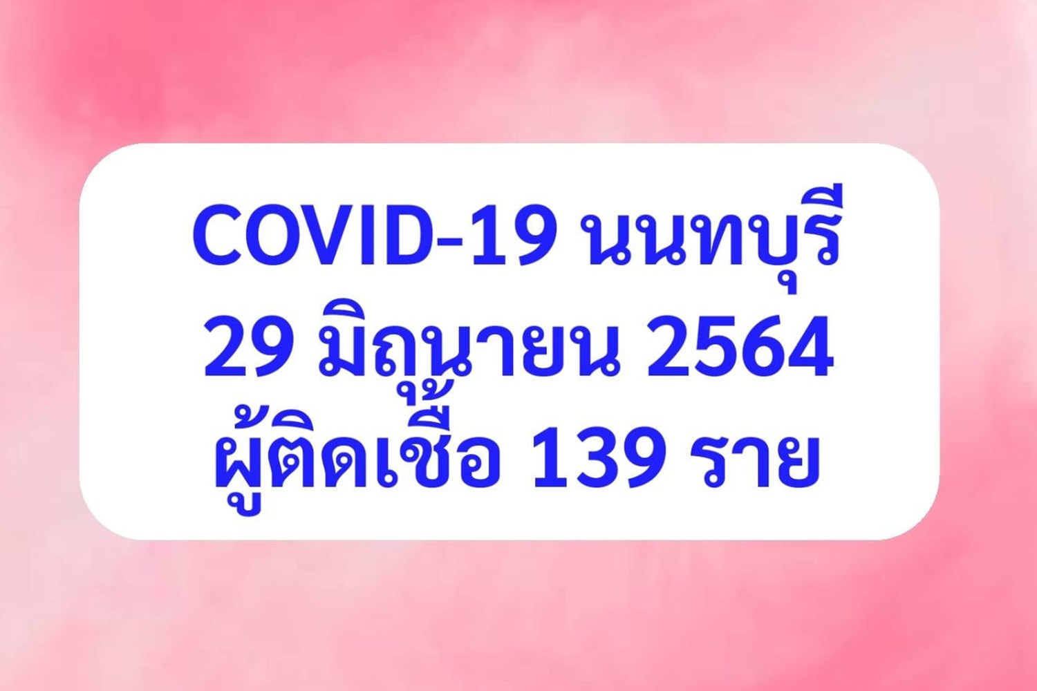 เมื่อวันที่ 29 มิ.ย.ศูนย์ข้อมูลโควิด-19 นนทบุรี สำนักงานสาธารณสุขจังหวัดนนทบุรี รายงานสรุปย่อ ผู้ป่วยยืนยันโควิด-19 จ.นนทบุรี พบผู้ติดเชื้อทั้งหมด 139 ราย
