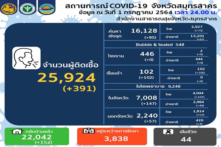 สำนักงานสาธารณสุขจังหวัดสมุทรสาคร รายงานสถานการณ์ COVID - 19 สมุทรสาคร ประจำวันที่ 1 ก.ค. 2564 เวลา 24.00 น. พบผู้ป่วยรายใหม่ 391 ราย จำแนกเป็นผู้ติดเชื้อจากค้นหาเชิงรุก 85 ราย โดยเป็นคนไทย 73 ราย ต่างชาติ 12 ราย และพบผู้ติดเชื้อที่เข้ามารับการตรวจในโรงพยาบาลอีก 204 ราย เป็นคนในจังหวัด 147 ราย จำแนกเป็นคนไทย 107 ราย ต่างชาติ 40 ราย กับคนนอกจังหวัดอีก 57 ราย จำแนกเป็นคนไทย 53 ราย ต่างชาติ 4 ราย และในวันนี้ยังพบผู้ติดเชื้อคลัสเตอร์ใหม่ อยู่ในเรือนจำจังหวัดสมุทรสาครเป็นคนไทยทั้งหมดอีก 102 ราย