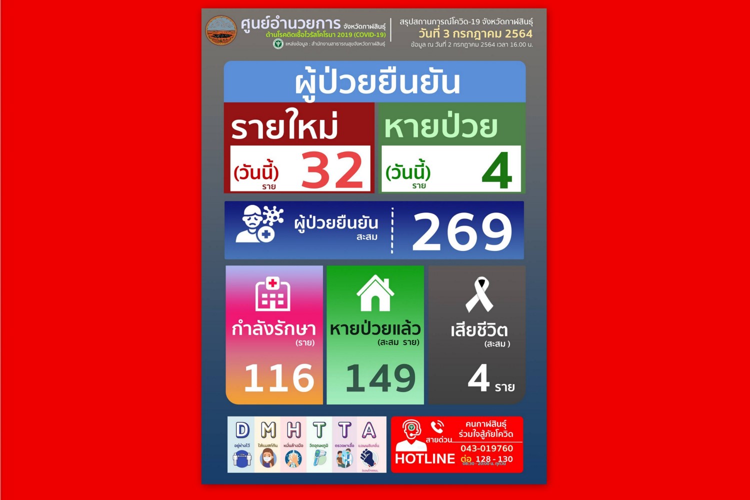 เมื่อวันที่ 3ก.ค.64 สถานการณ์การติดเชื้อ COVID-19 ในจังหวัดกาฬสินธุ์ พบผู้ป่วยรายใหม่ 32 ราย เป็นผู้ติดเชื้อจาก กทม. 27 ราย สมุทรปราการ 2 ราย และนนทบุรี ปทุมธานี และอุทัยธานี จังหวัดละ 1 ราย ผู้ป่วยยืนยันสะสม 269 รายหายป่วยแล้ว 149 ราย เสียชีวิตสะสม 4 ราย